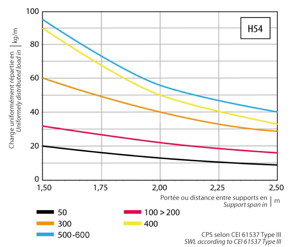 charge de travail sécurisée max. selon IEC 61537 avec dist. supports de 2,5m: