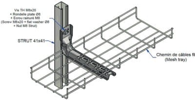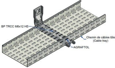 Montage mural direct, ou montage sur rail S100U (avec clame) ou rail STRUT 41. Fixation rapide des chemins de câbles Fil et fixation des chemins de câbles Tôle par TRCC M6x12 ou Agraftol.