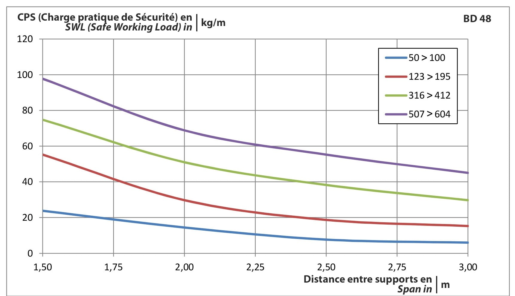 charge de travail sécurisée max. selon IEC 61537 avec dist. supports de 2,5m: