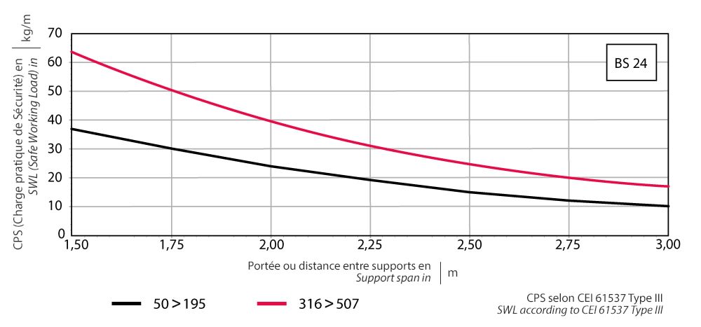 charge de travail sécurisée max. selon IEC 61537 avec dist. supports de 1,5m: