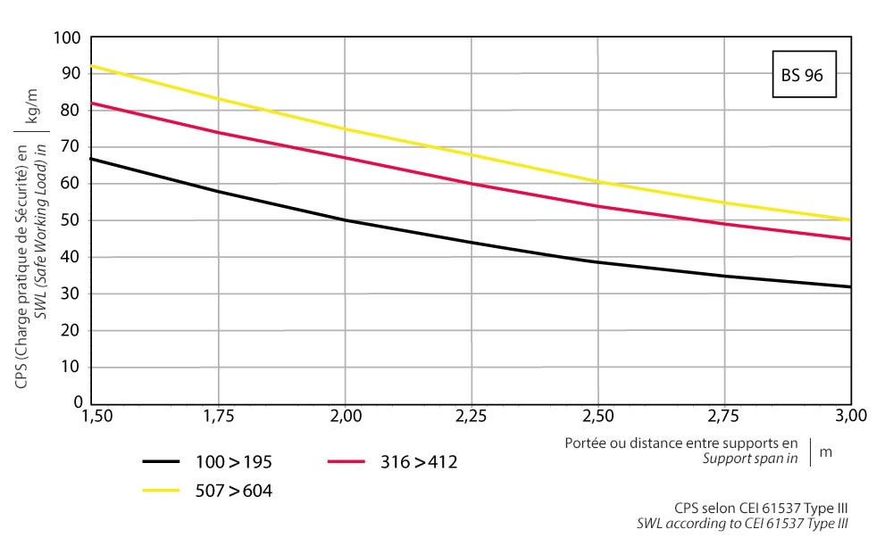 charge de travail sécurisée max. selon IEC 61537 avec dist. supports de 1,5m:
