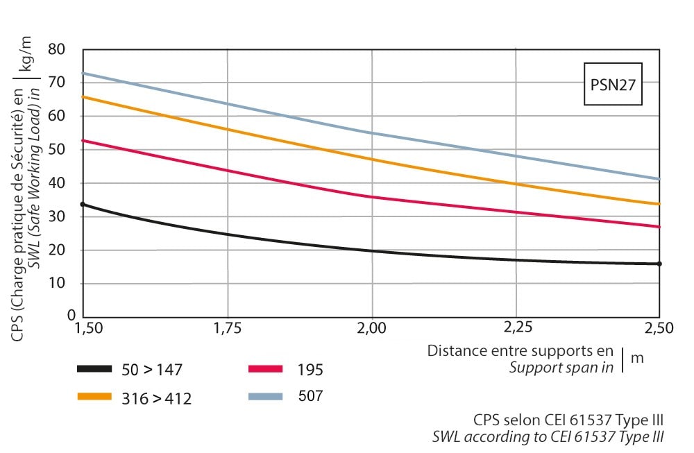 charge de travail sécurisée max. selon IEC 61537 avec dist. supports de 2,5m: