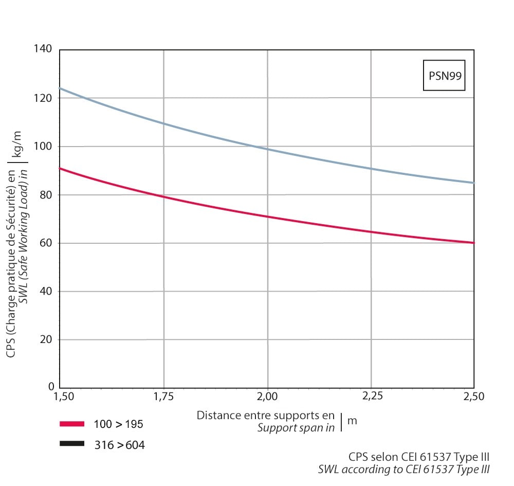 charge de travail sécurisée max. selon IEC 61537 avec dist. supports de 2,5m:
