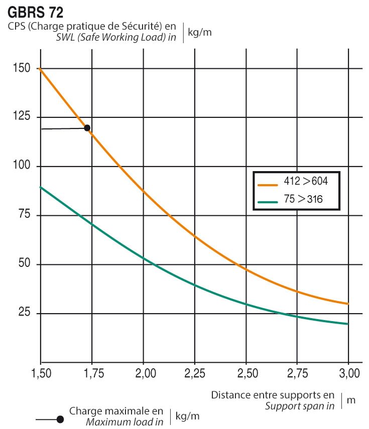 charge de travail sécurisée max. selon IEC 61537 avec dist. supports de 2,5m: