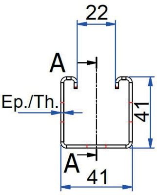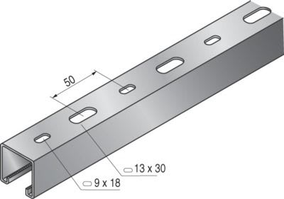 Rail STRUT, gamme RS, hauteur 41 mm, largeur 41 mm, épaisseur 1.80 mm, perforé, longueur 3 m, perforations oblongs 9x18 mm et 13x30 mm, finition SZ