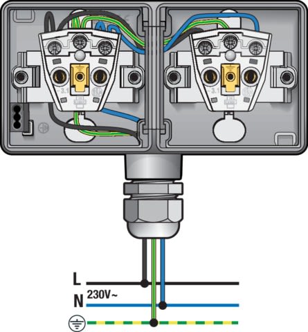 Prise double horizontale étanche aux projections d?eau, avec broche de terre, obturateurs de protection et bornes à vis - y compris un boîtier avec une entrée au-dessus, couleur gris