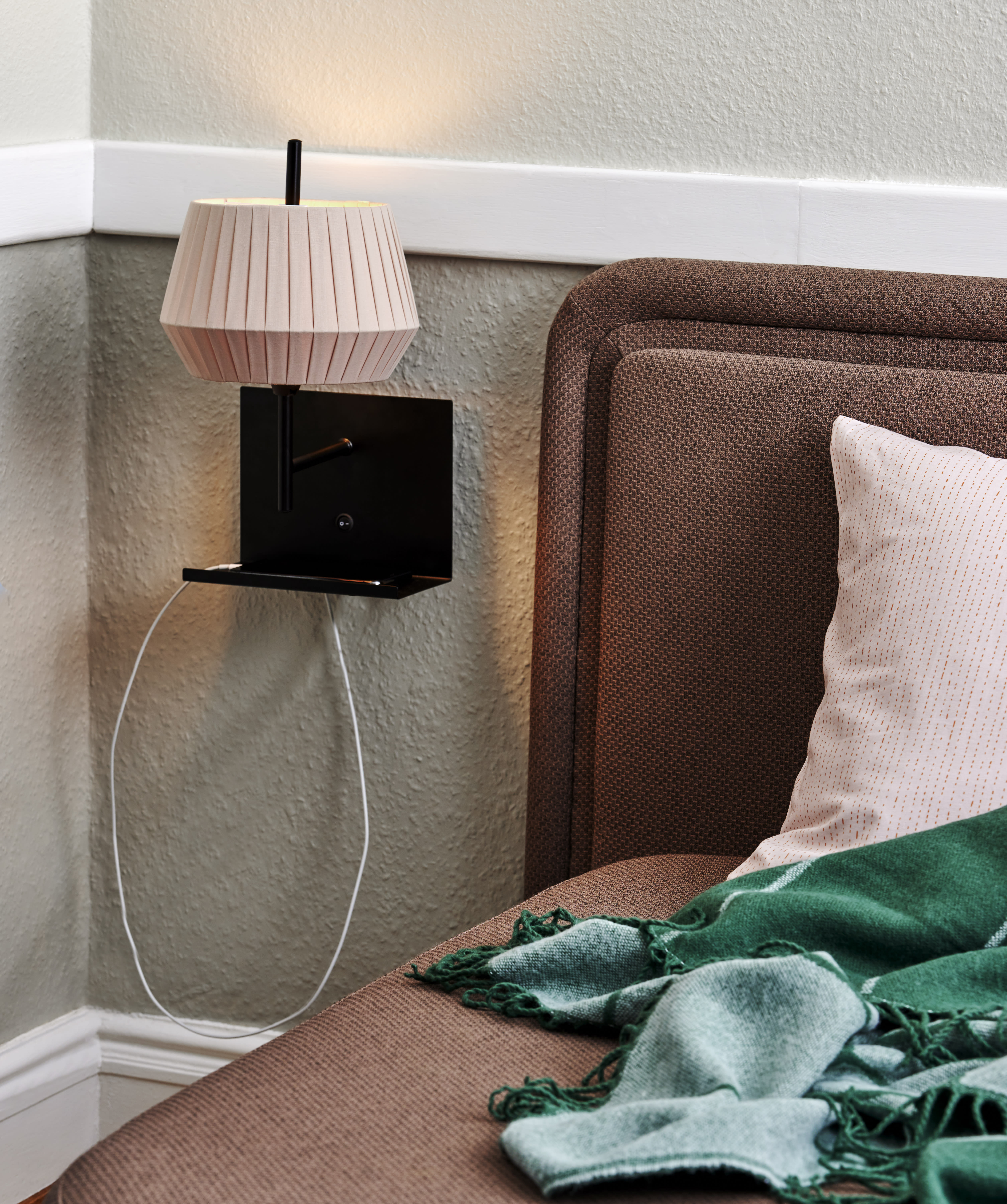 L'abat-jour arrondi de la série Dicte est fabriqué à partir de tissu doux et noué à la main qui ajoute une sensation confortable et accueillante à chaque pièce. L'applique murale Dicte dispose d'une étagère intégrée et d'un port USB.