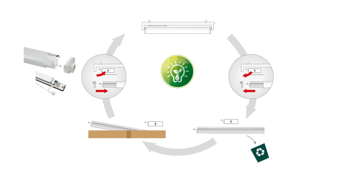 easy eXchange - Notre concept pour une nouvelle vie.Nous garantissons un éclairage durable grâce aux modules LED et aux appareillages facilement remplaçables. Lors de la fin de vie du luminaire, les composants électroniques (Led et appareillage) sont très faciles à remplacer par de nouveaux composants. Le corps du luminaire et le tube de protection peuvent continuer à être utilisés, permettant d'éviter de nouvelles acquisitions inutiles, d'économiser du temps de montage er de préserver les ressources. Ce système remplace le système RAPDEX.