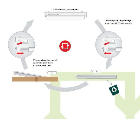 easy eXchange - Notre concept pour une nouvelle vie.Nous garantissons un éclairage durable grâce aux modules LED et aux appareillages facilement remplaçables. Lors de la fin de vie du luminaire, les composants électroniques (Led et appareillage) sont très faciles à remplacer par de nouveaux composants. Le corps du luminaire et le tube de protection peuvent continuer à être utilisés, permettant d'éviter de nouvelles acquisitions inutiles, d'économiser du temps de montage er de préserver les ressources. Ce système remplace le système RAPDEX.