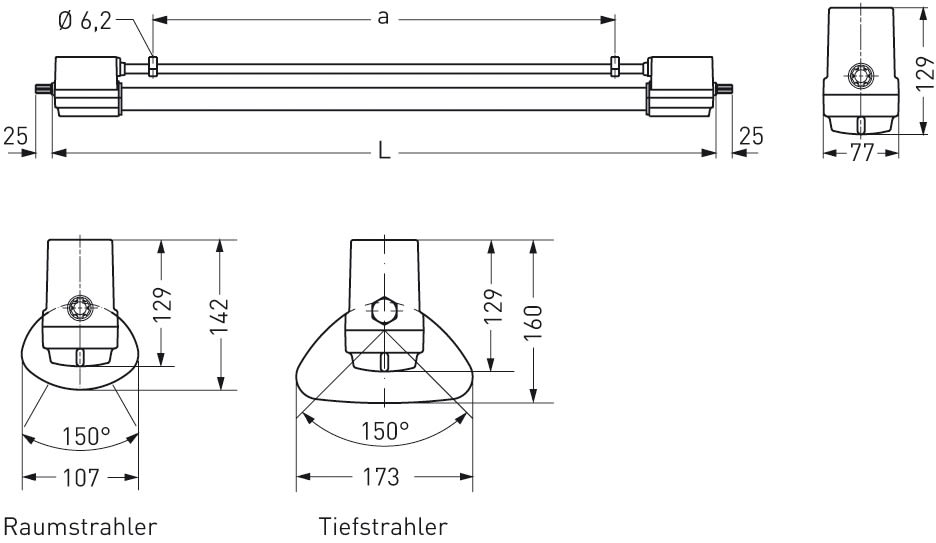Luminaire apparent BREMERHAVEN 1X36W HT 60° compensé. Fourreau de protection, vitre en verre silicate, rayonnement libre. Température extrême de -25°C jusqu'à +60°C.