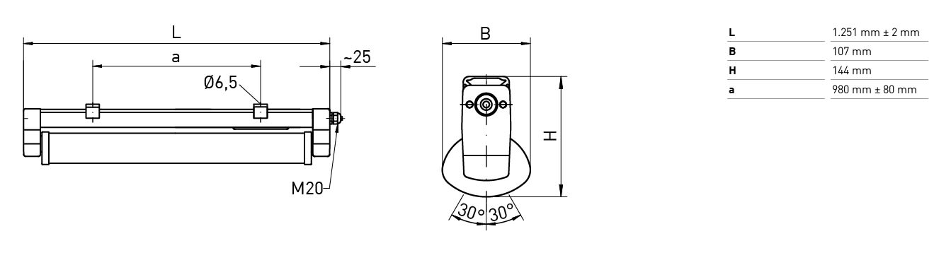 Luminaire apparent COESFELD PLUS m1200, extensif, 3420 lm, 20W, 4000K. Tube réflecteur en PMMA Transopal® (résistant aux chocs), IK 04. Résistant à de fortes concentrations d'ammoniaques. Température ambiante -25°C à + 40°C.