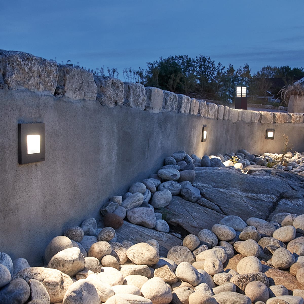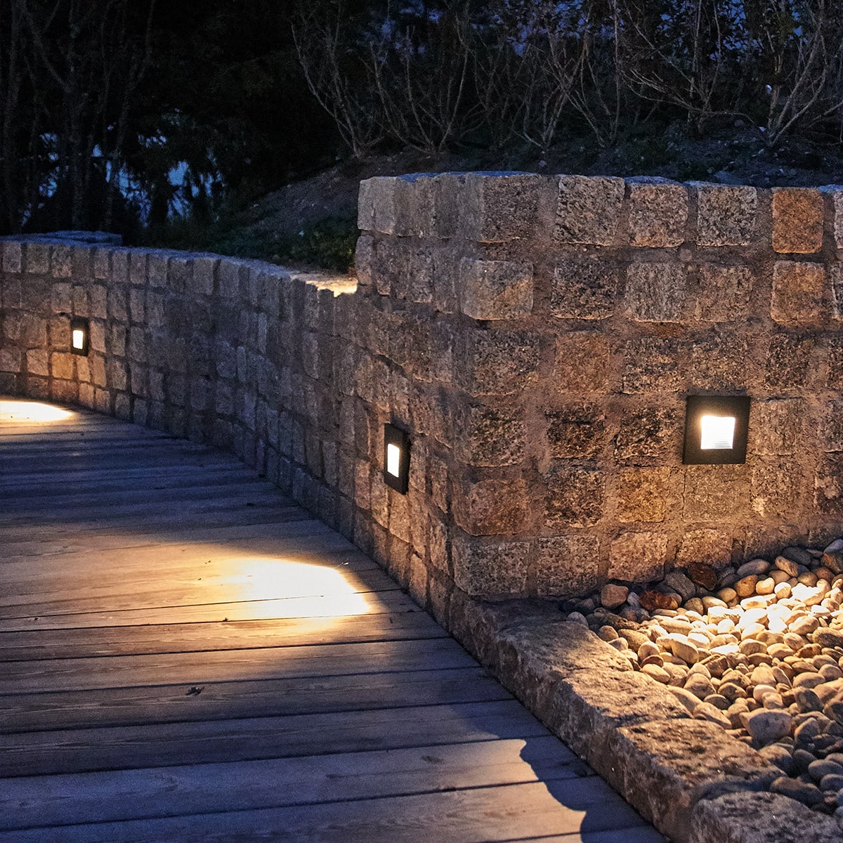 Encastré mural en aluminium. Pour une parfaite harmonie de vos projets il peut être coordonné aux bornes et autres encastrés de la même gamme.