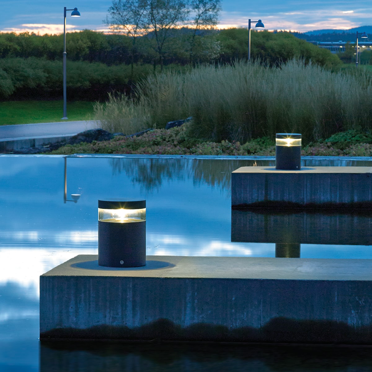 IK10 et pas de pollution lumineuse avec cette très élégante borne et sa lumière dirigée vers le bas. Pour les installations en surplomb, nous recommandons la version avec verrerie givrée pour éviter tout risque d'éblouissement.