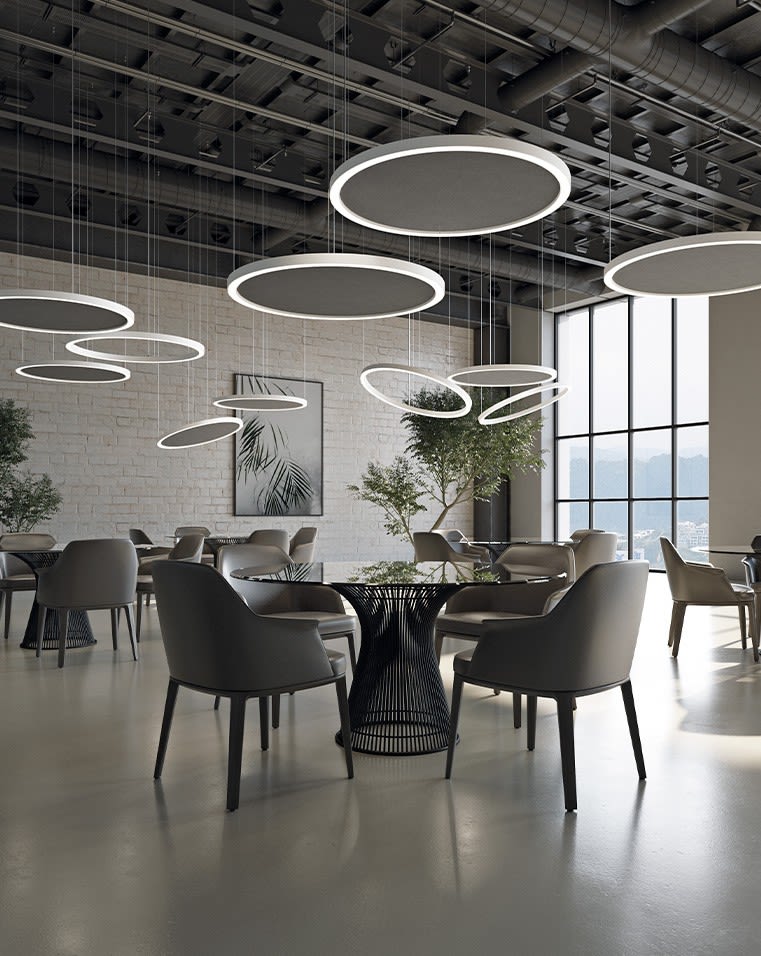 Novalux présente la solution idéale pour allier confort acoustique et solutions d’éclairage. Les panneaux insonorisants du nouvelHALOS ACOUSTIC contribuent à améliorer le bien-être général des personnes qui travaillent et vivent dans la pièce, tout en donnantdu caractère, grâce aux finitions des matériaux à effet to remove noir graphite et gris fer.
