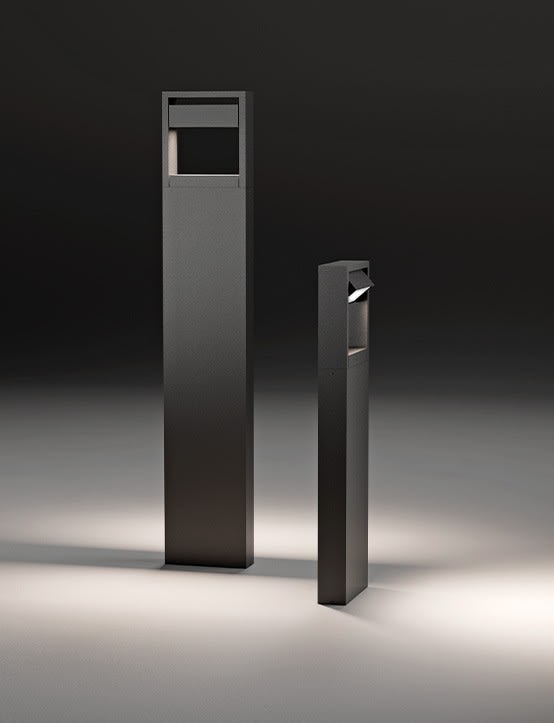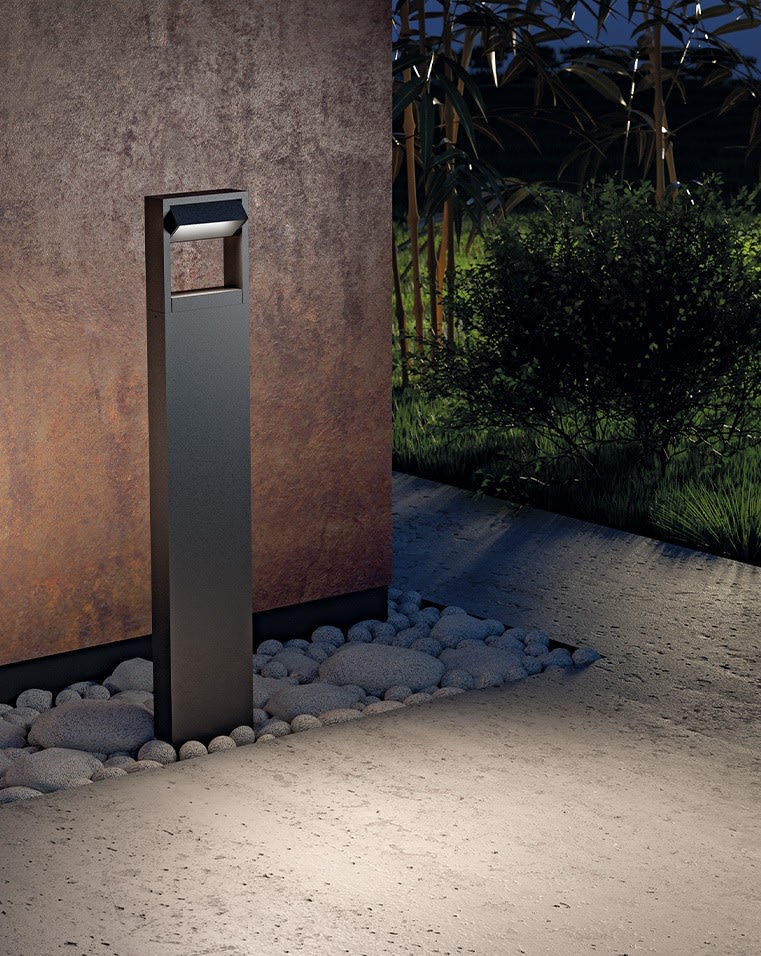 La borne LED IP65 a un design solide et minimaliste. L’élément contenant la source LED, situé au sommet de la borne, peut être positionné vers le bas pour un éclairage symétrique, ou orienté à 45° pour devenir une borne à émission asymétrique.