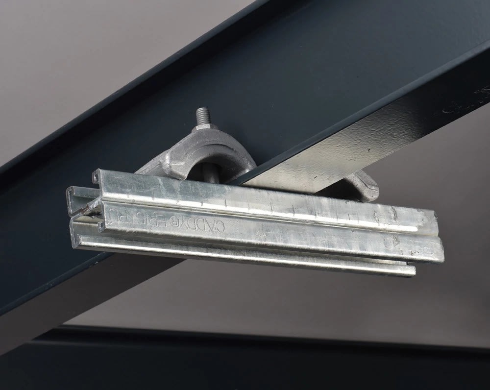 Kit Accroche Tout galvanisé à chaud (Série 6000) avec rail double 41x21 de 600 mm pour poutre IPN ou IPE d'épaisseur 3-30 mm. Idéal pour l'installation de chemin de câbles, système d'éclairage et de ventilation à l'aide de tige filetée.