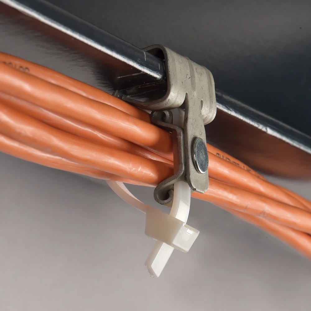 Gamme complète d'attaches à frapper robustes acier ressort et inox pour installation de câbles/canalisations électriques par collier de câblage (largeur 9mm, ép. 2mm, fourni ou non) sur IPN/IPE ép. 2-28mm (3-20mm pour inox). Pose sans perçage ni soudure
