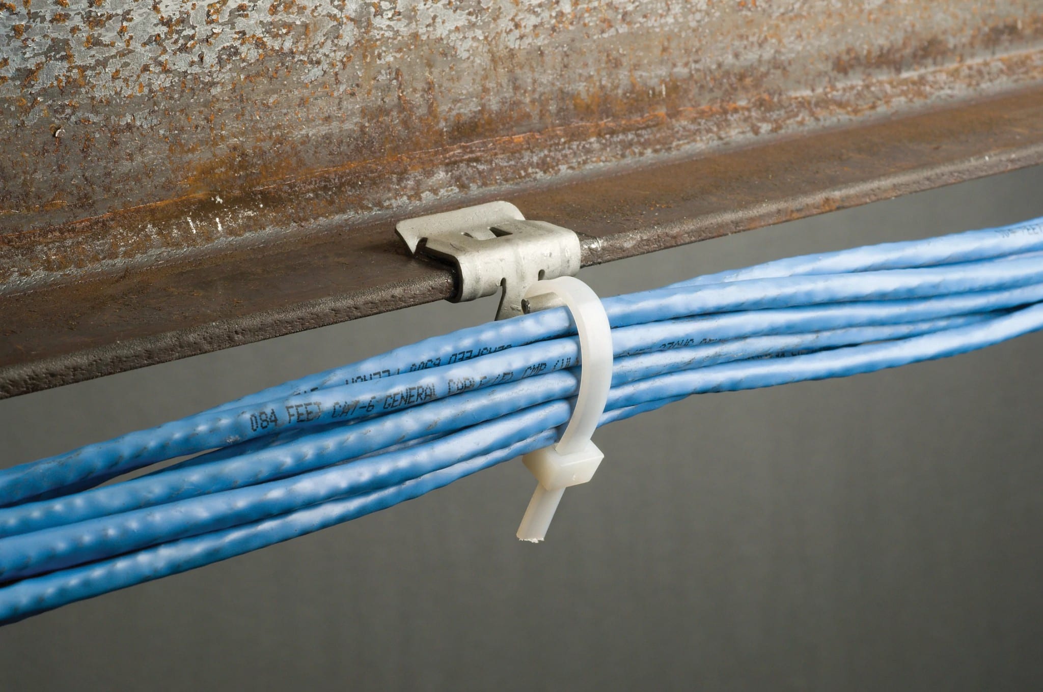 Gamme complète d'attaches à frapper robustes acier ressort et inox pour installation de câbles/canalisations électriques par collier de câblage (largeur 9mm, ép. 2mm, fourni ou non) sur IPN/IPE ép. 2-28mm (3-20mm pour inox). Pose sans perçage ni soudure