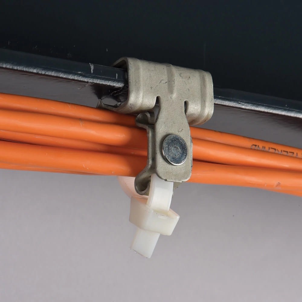 Gamme complète d'attaches à frapper robustes acier ressort et inox pour installation de câbles/canalisations électriques par collier de câblage (largeur 9mm, ép. 2mm, fourni ou non) sur IPN/IPE ép. 2-28mm (3-20mm pour inox). Pose sans perçage ni soudure
