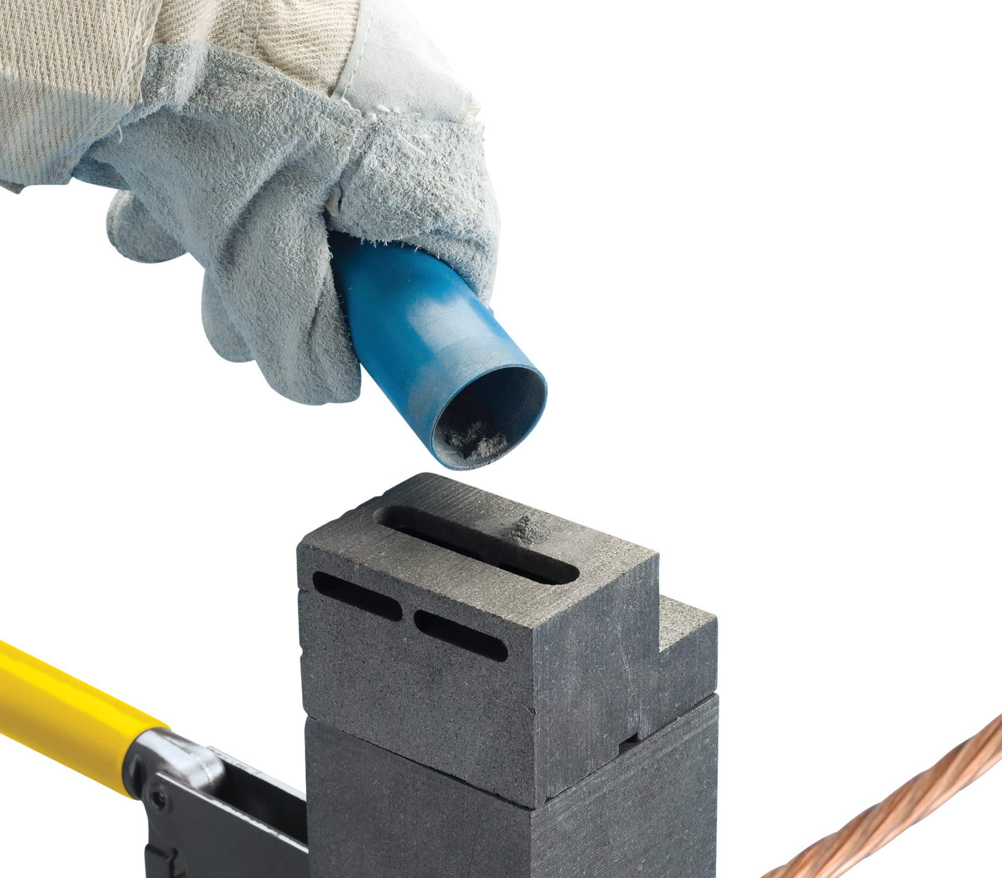 Le matériau Cadweld F20 est surtout utilisé pour mettre à la terre/lier. Emballé dans un tube bleu, il est versé dans le moule et allumé avec un amorceur. A environ 65 g de métal de soudure et une petite qté de matériau de base.