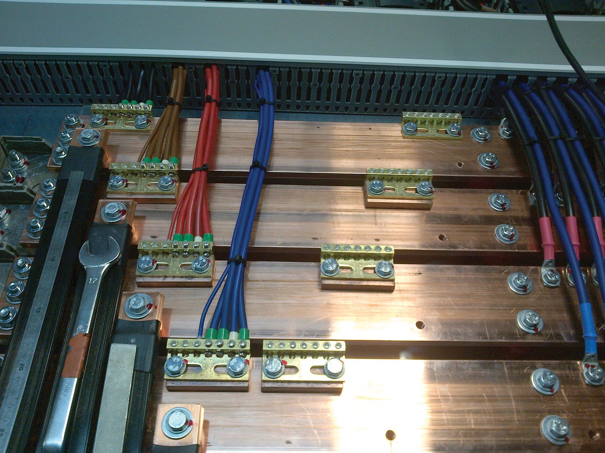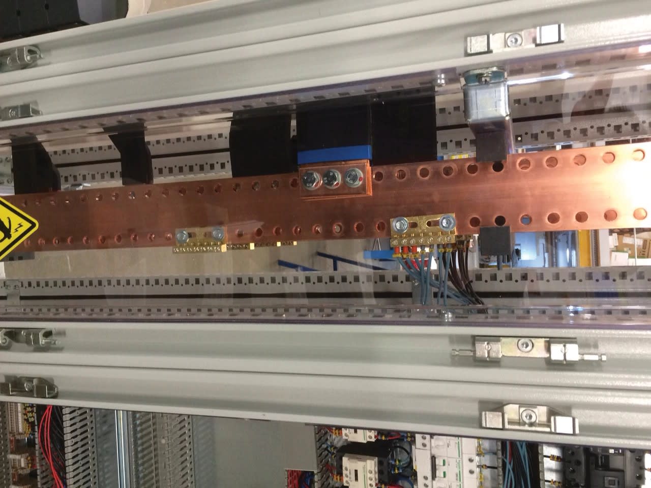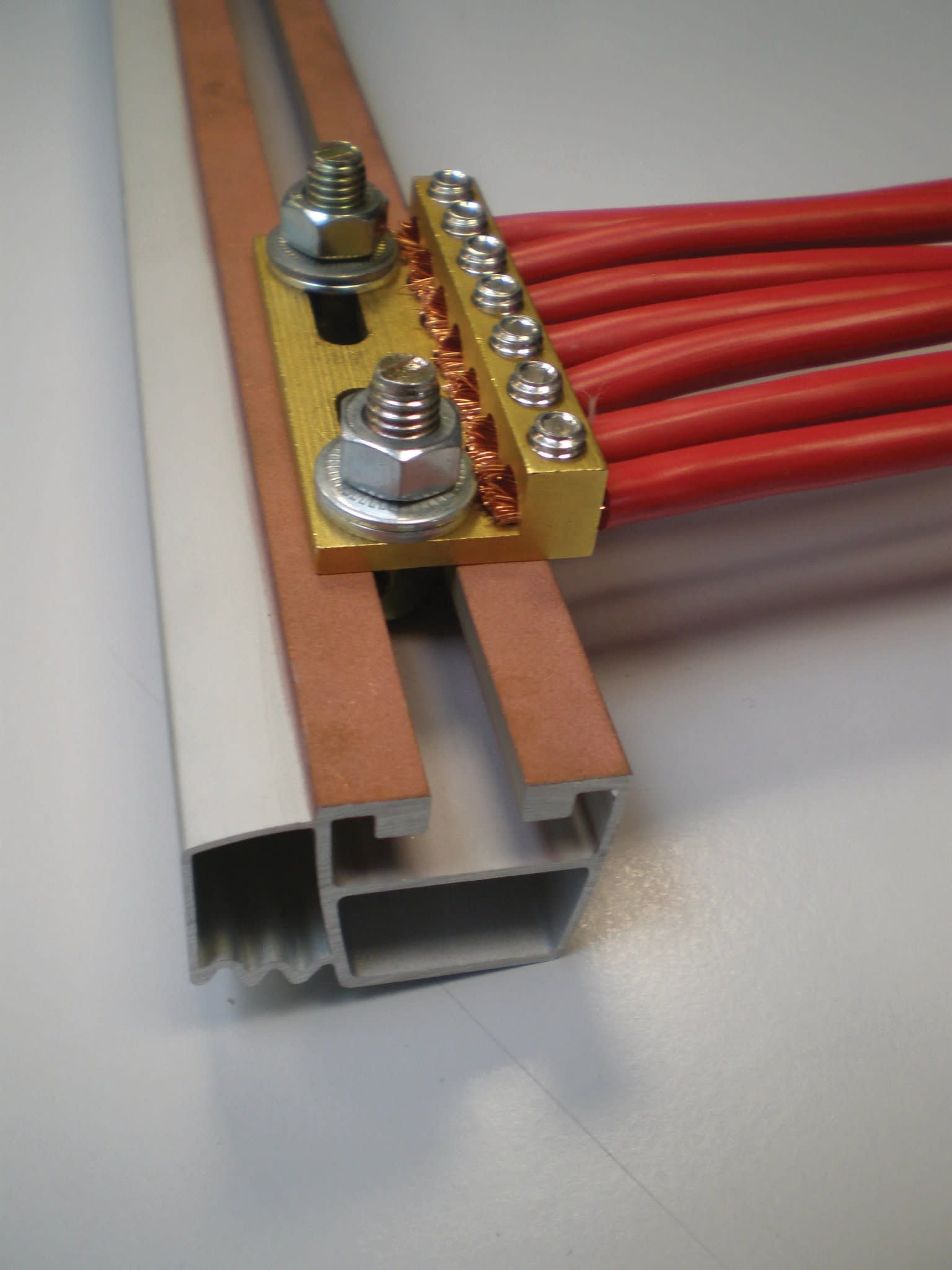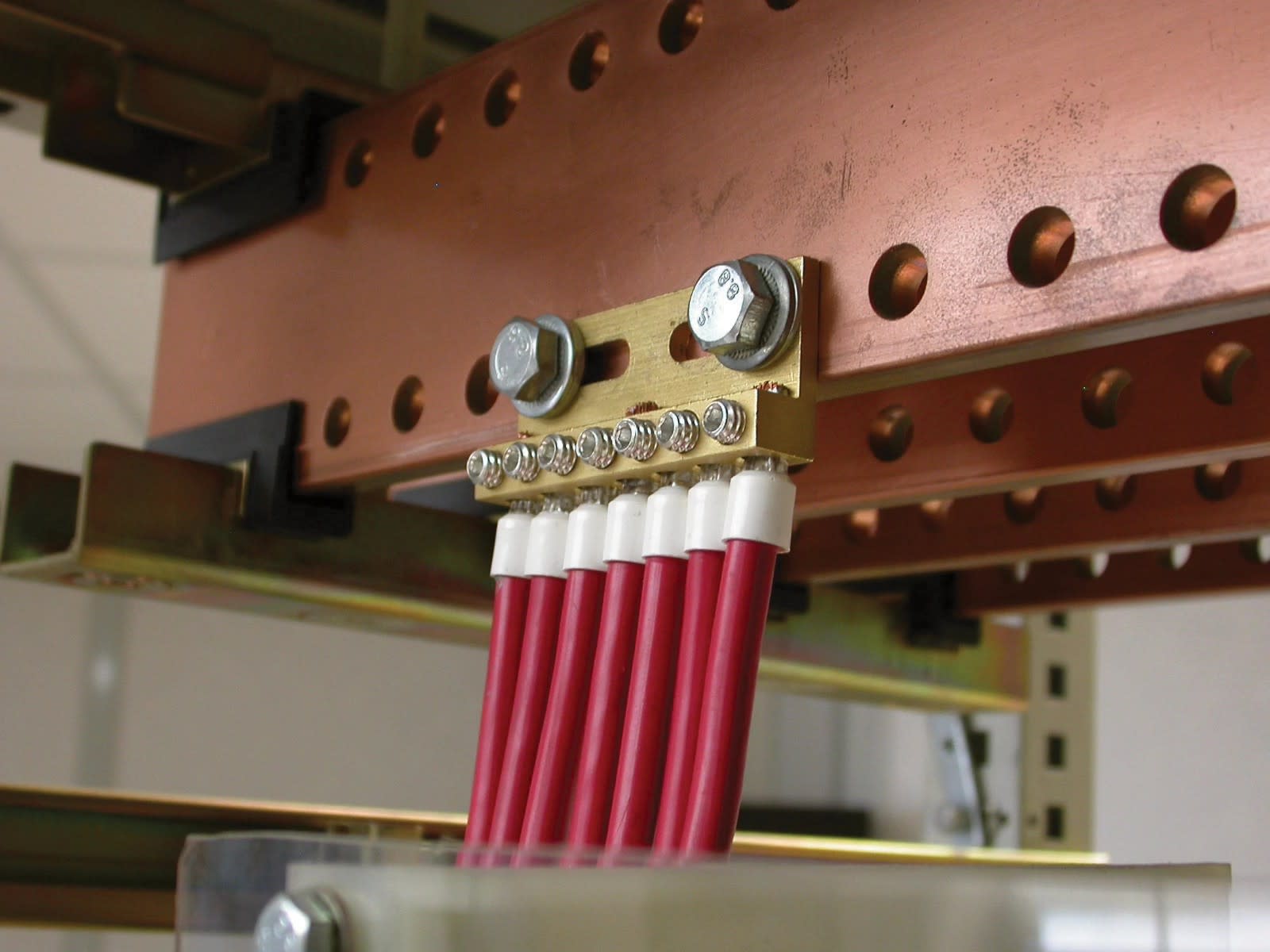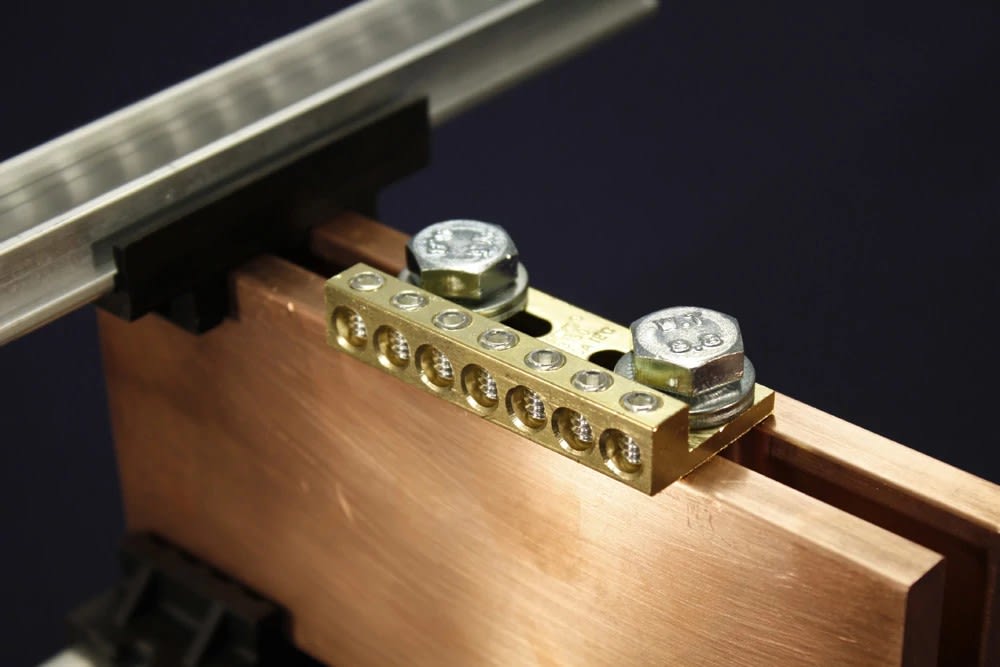 Barre de connexion de puissance utilisée pour la distribution de plusieurs conducteurs de mise à la terre. Barre de connexion universelle en laiton CB7X16.