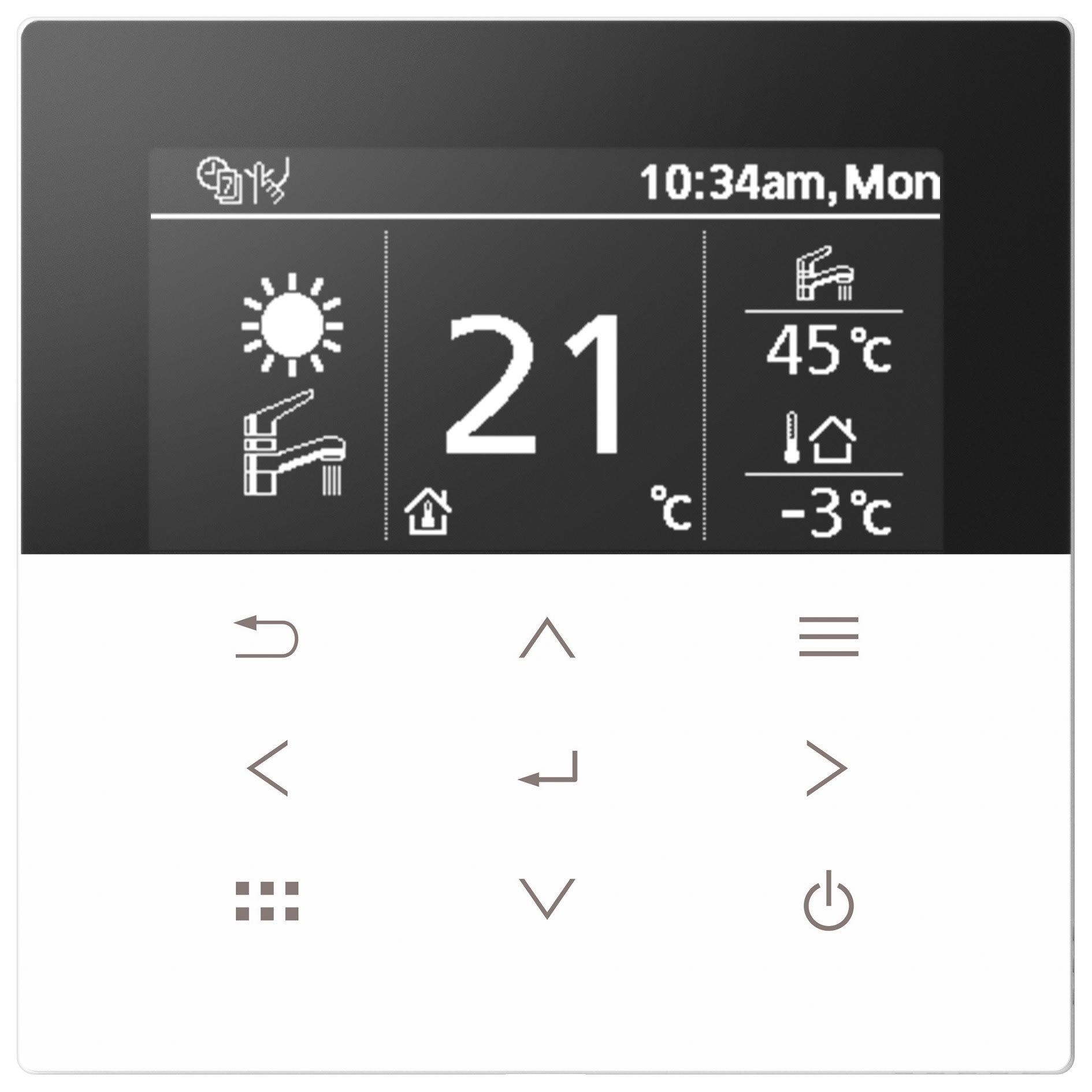 Télécommande Aquarea assortie au reste du système, avec une interface utilisateur optimisée et des fonctionnalités amélioréesLa télécommande peut être séparée de l’unité intérieure et installée dans votre salon.Fonctions de l’installateur :Configuration du système, configuration du fonctionnement (y compris les modes chaud / froid, configuration ΔT), mode déshumidification et mode bivalent économique, entre autres.Fonctions de l’utilisateur final :Sélection du mode (y compris les modes auto, powerful et super quiet), programmateur hebdomadaire et suivi de la consommation d’énergie, entre autres.