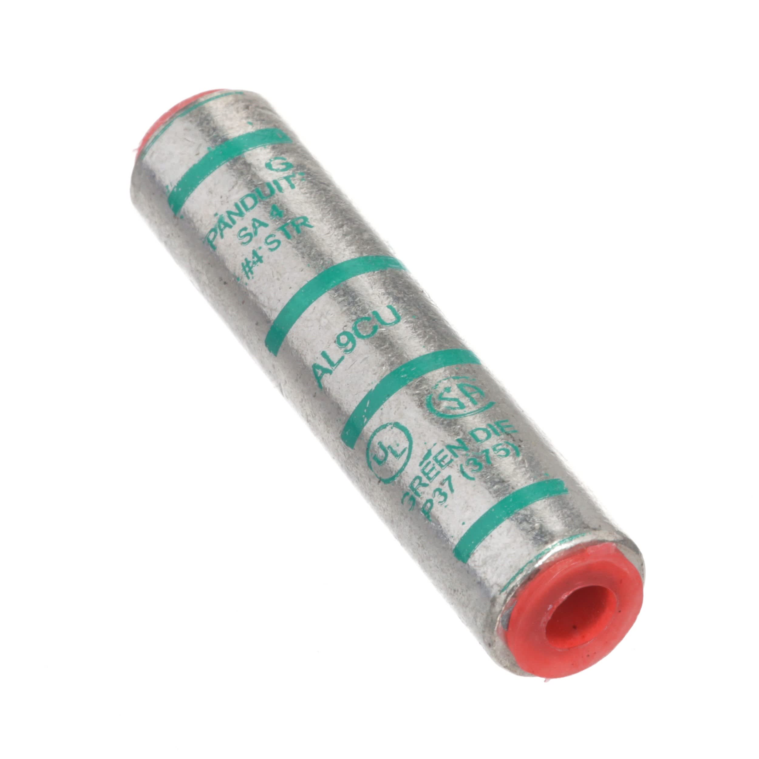 Epissure à compres. alu, étamée pour inhiber la corrosion, alu à paroi épaisse haute conduc., joint pré-rempli en usine et scellé avec fiche d'extr. mâle aisément extractible, n° d'index matrice Panduit et concurrents spé. marqués sur le corps pour bien sélec. la matrice de sertis., butée solide interne empêchant la sur-insertion du conducteur, homol. UL et cert. CSA à 35 KV, temp. nominale de 90°C lors du sertis. avec outils de sertis. Panduit et outils de sertis. et matrices concurrents spé.