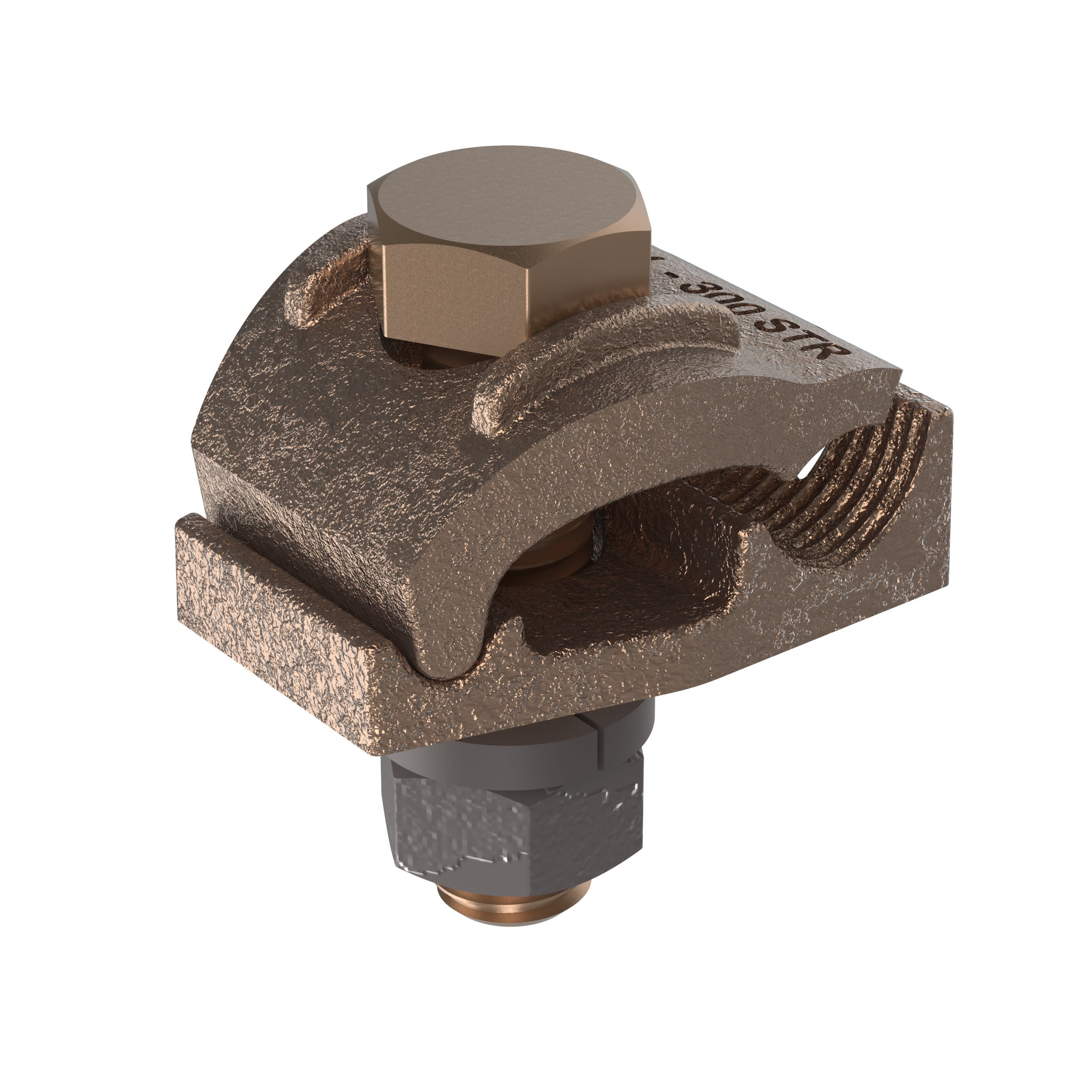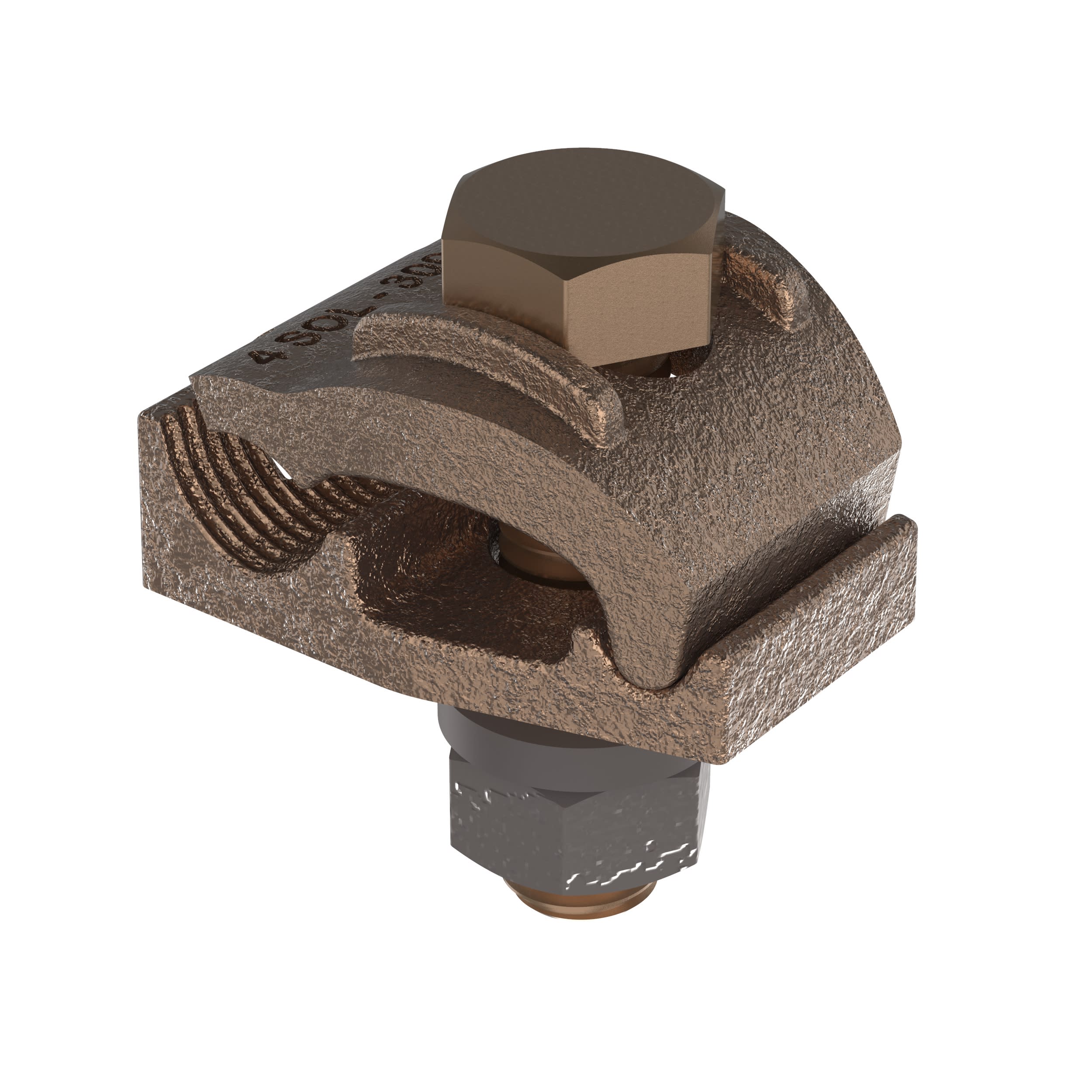 La pince de mise à la terre en bronze GM-3E-X est utilisée pour mettre à la terre un conducteur de code en cuivre sur des surfaces planes. Plage de taille du conducteur de 4 Sol. - 300 kcmil.