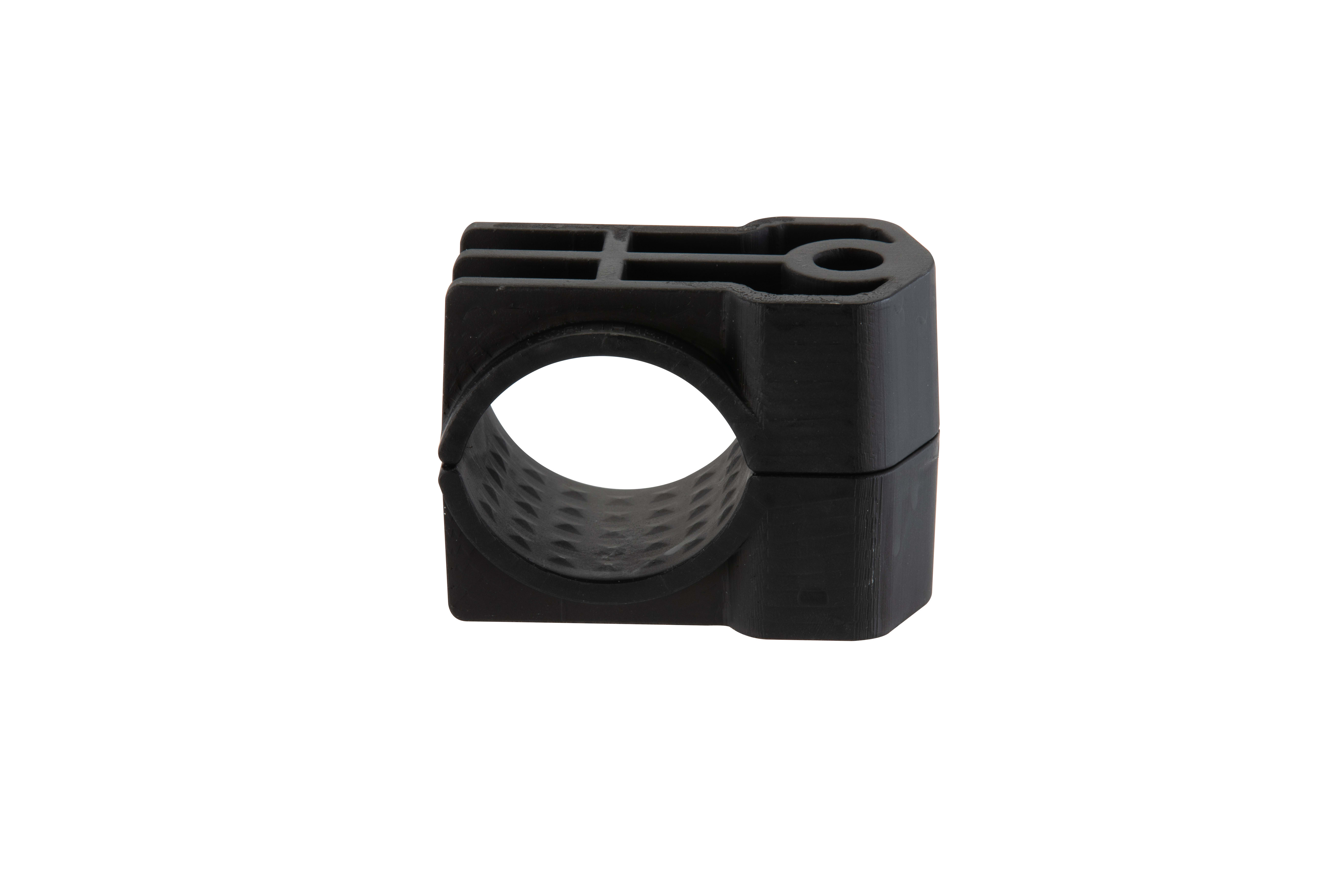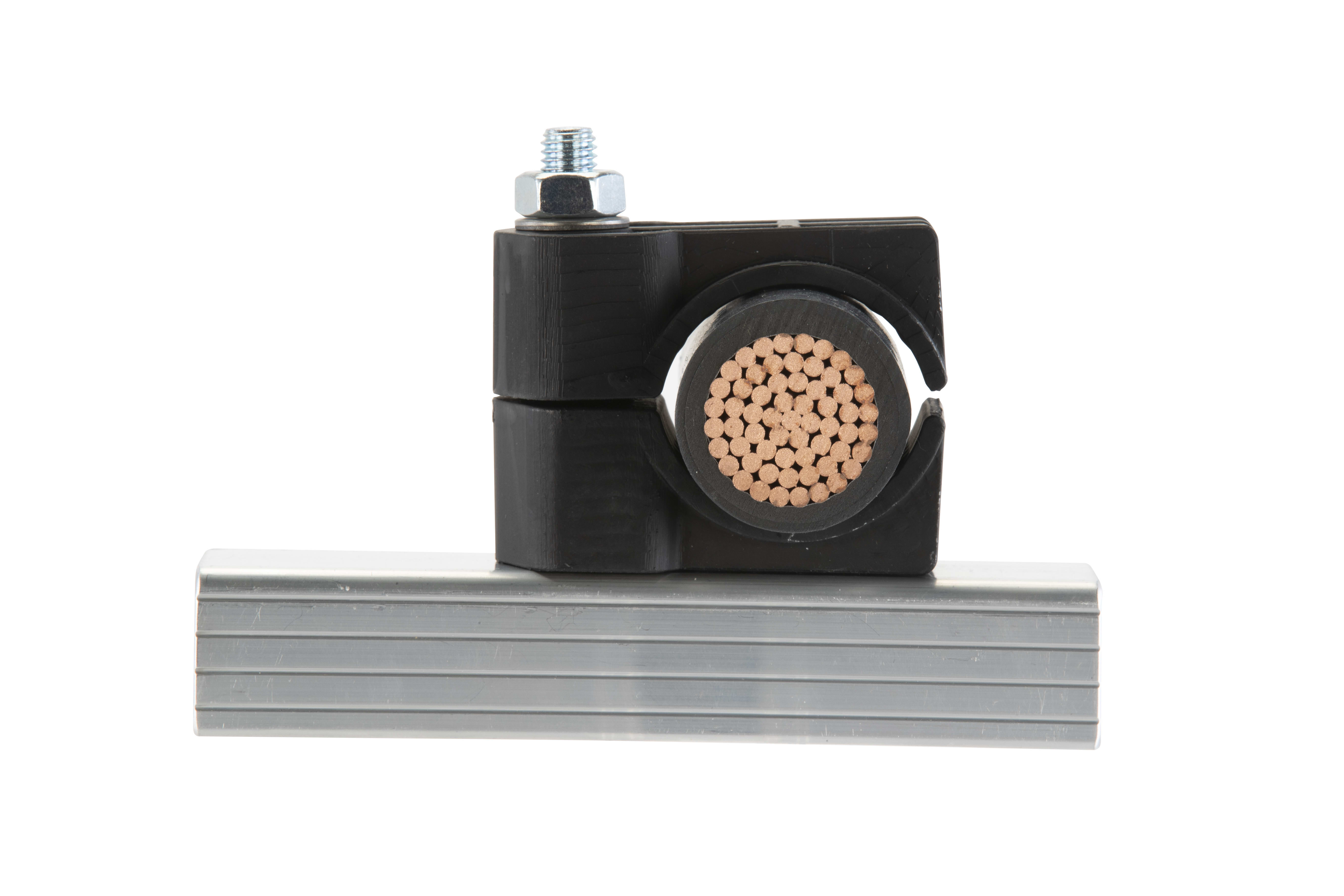 Taquet de câble à un trou en polymère CCPL1H5157-X pour résister aux courts-circuits de faible à moyenne intensité dans des environnements moins difficiles. Certifié IEC 61914:2015, testé jusqu'à 69,5kA de courant de défaut max. et retient les câbles en cas de court-circuit. Pour diamètre de câble de 51-57mm, s'installe dans le trou du barreau de chemin de câbles et le boulon M10 (non fourni). En polyamide armé de verre et doté de bords arrondis pour protéger l'isolation des câbles.