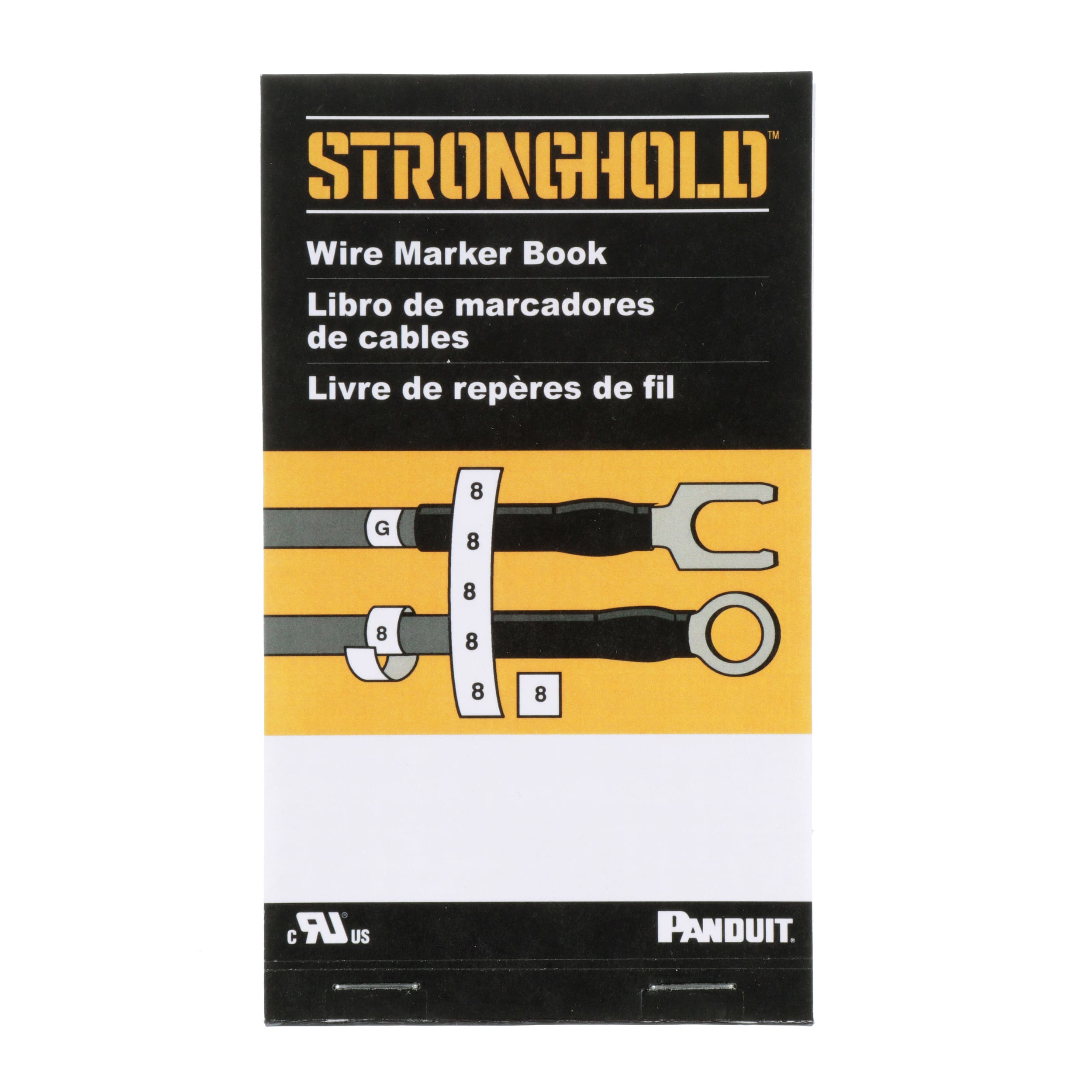 Les livrets d'identificateurs de câbles préimprimés PCMB-1 StrongHold sont pratiques grâce à leur format de poche ; ils contiennent des étiquettes pour câble imprimées sur une toile vinyle. Les marqueurs peuvent supporter jusqu'à 5 ans d'exposition aux UV à l'extérieur et résister à l'huile et aux abrasions. Elles peuvent également être séparées en deux morceaux afin que chaque extrémité du conducteur puisse avoir une étiquette. La légende comprend les nombres 0-9 ; 45 ; 45 identificateurs par légende ; 10 pages par livret.