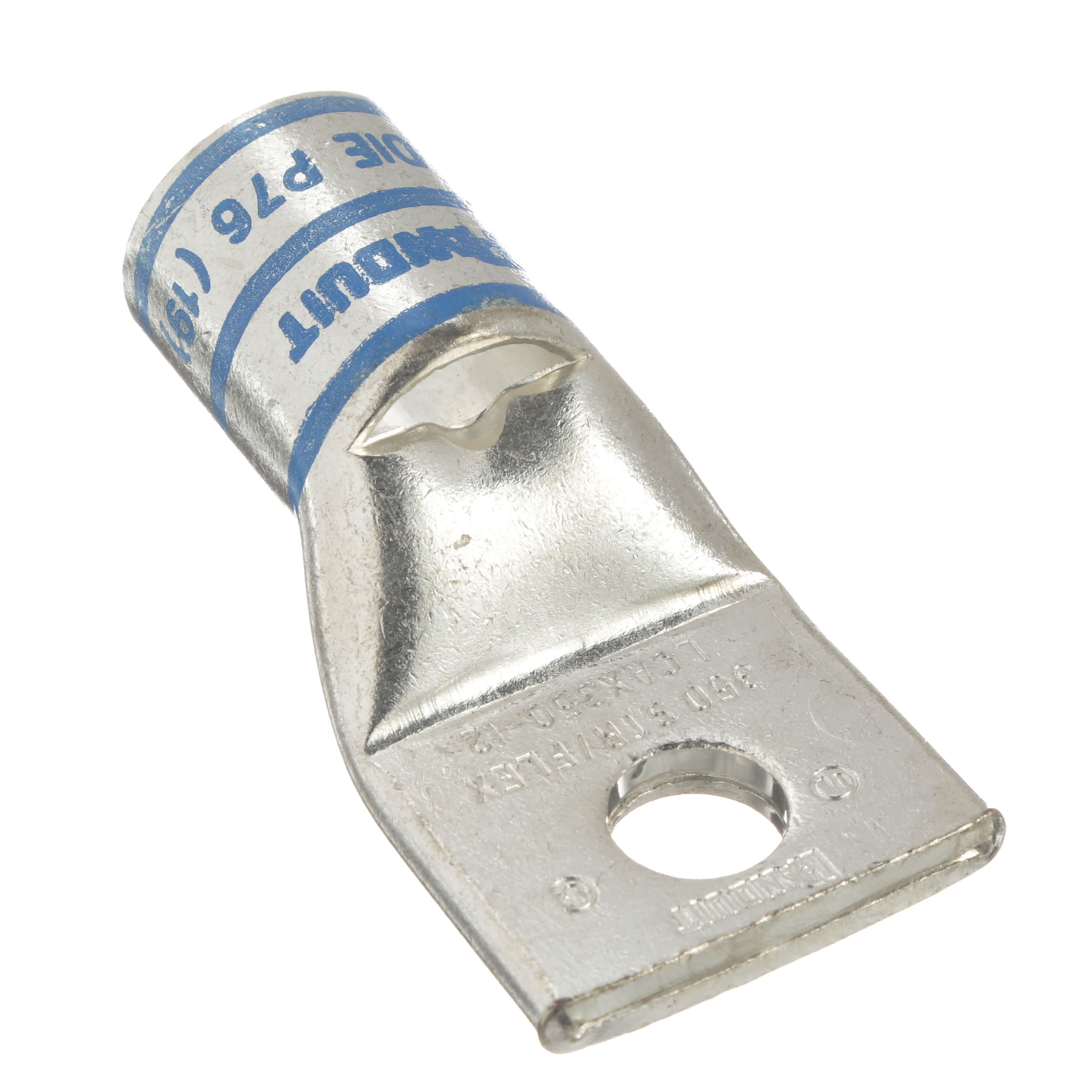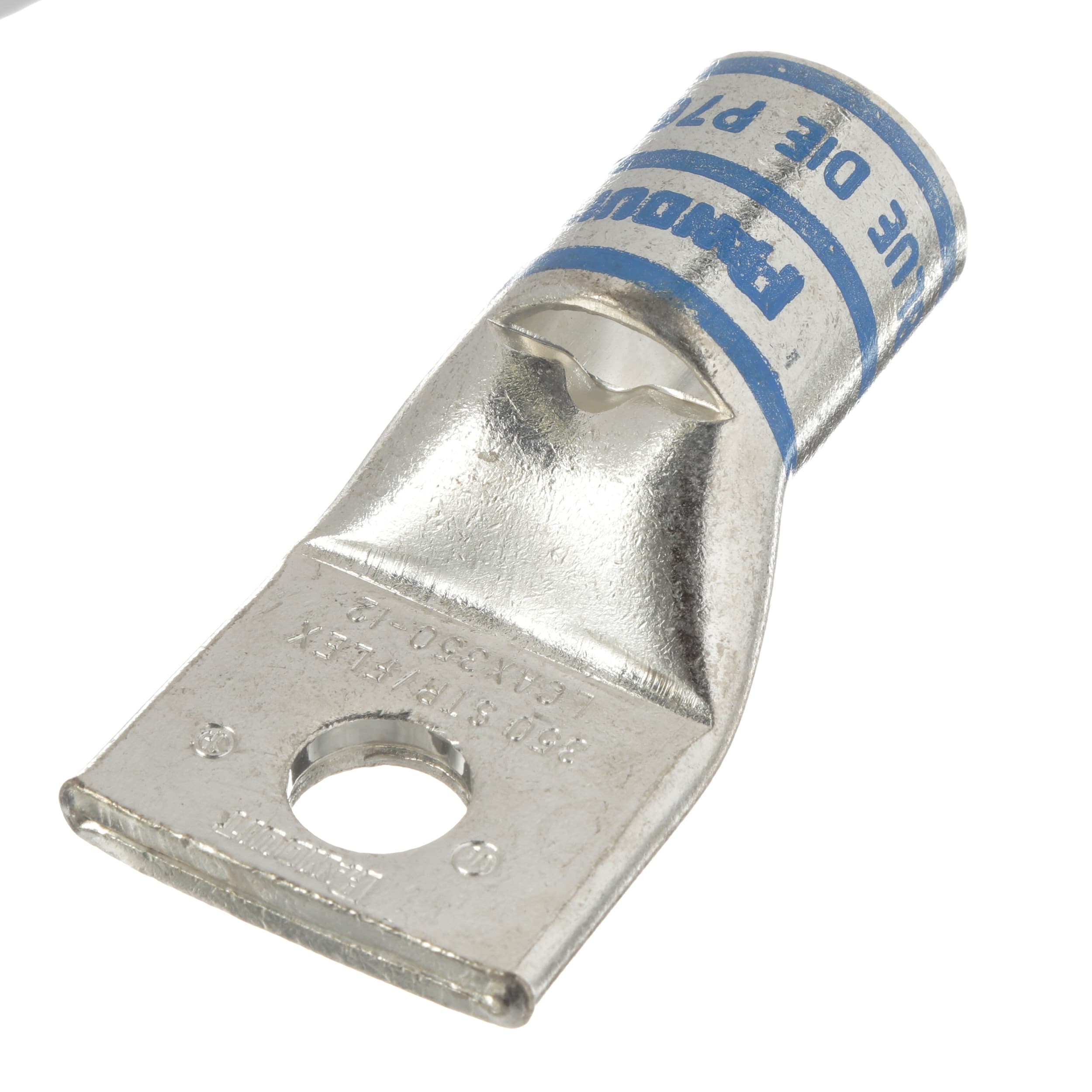 La cosse de compression en cuivre à un trou et fût standard LCAX350-12-6 possède des fûts à codage couleur et marquage avec numéros d'index de matrice Panduit et concurrents pour une sélection de matrice de sertissage adéquate. Une fenêtre d'inspection permet d'assurer visuellement l'insertion complète des conducteurs, et la finition étamée permet d'inhiber la corrosion. Homologué UL et certifié CSA pour 35 kV et température homologuée à 90 °C.