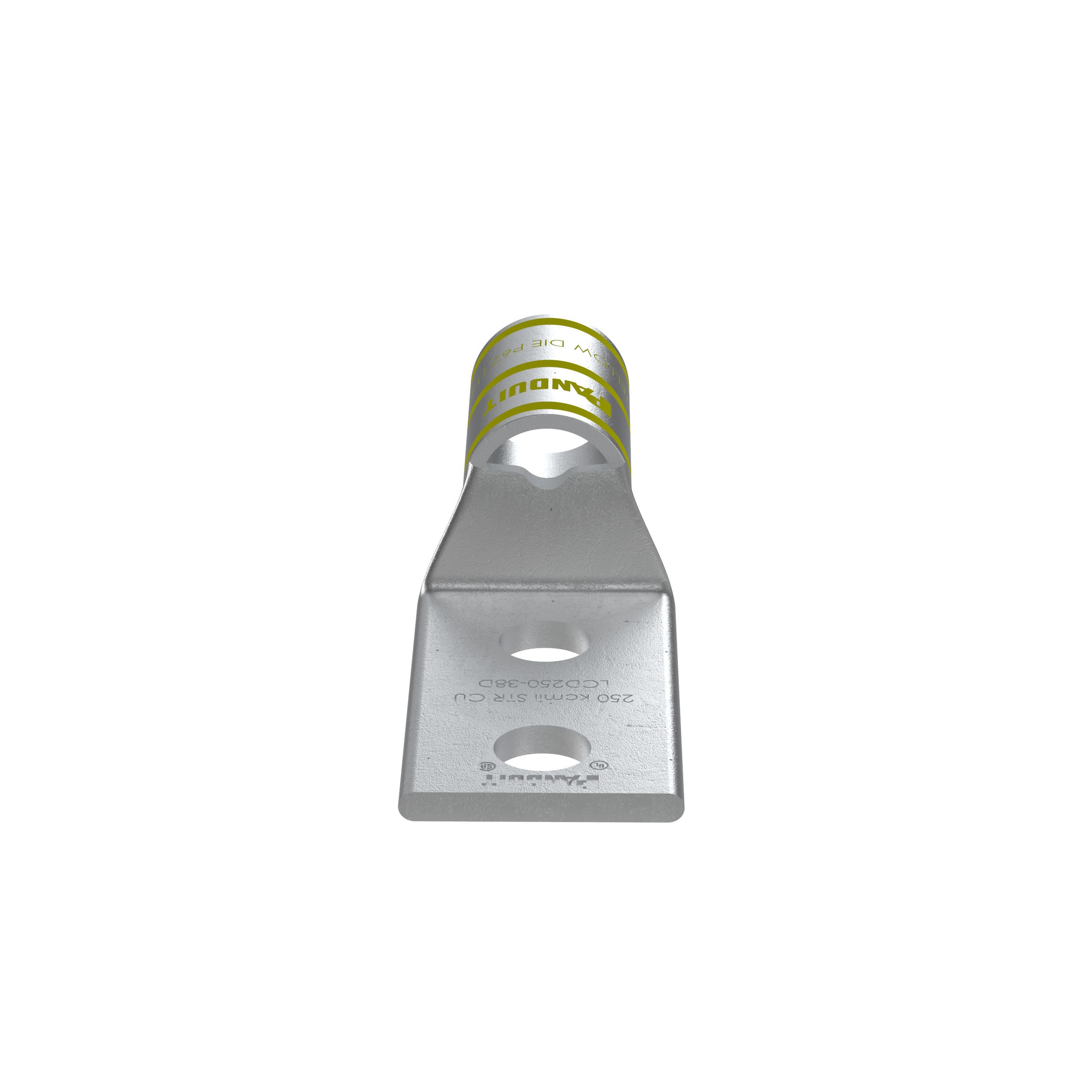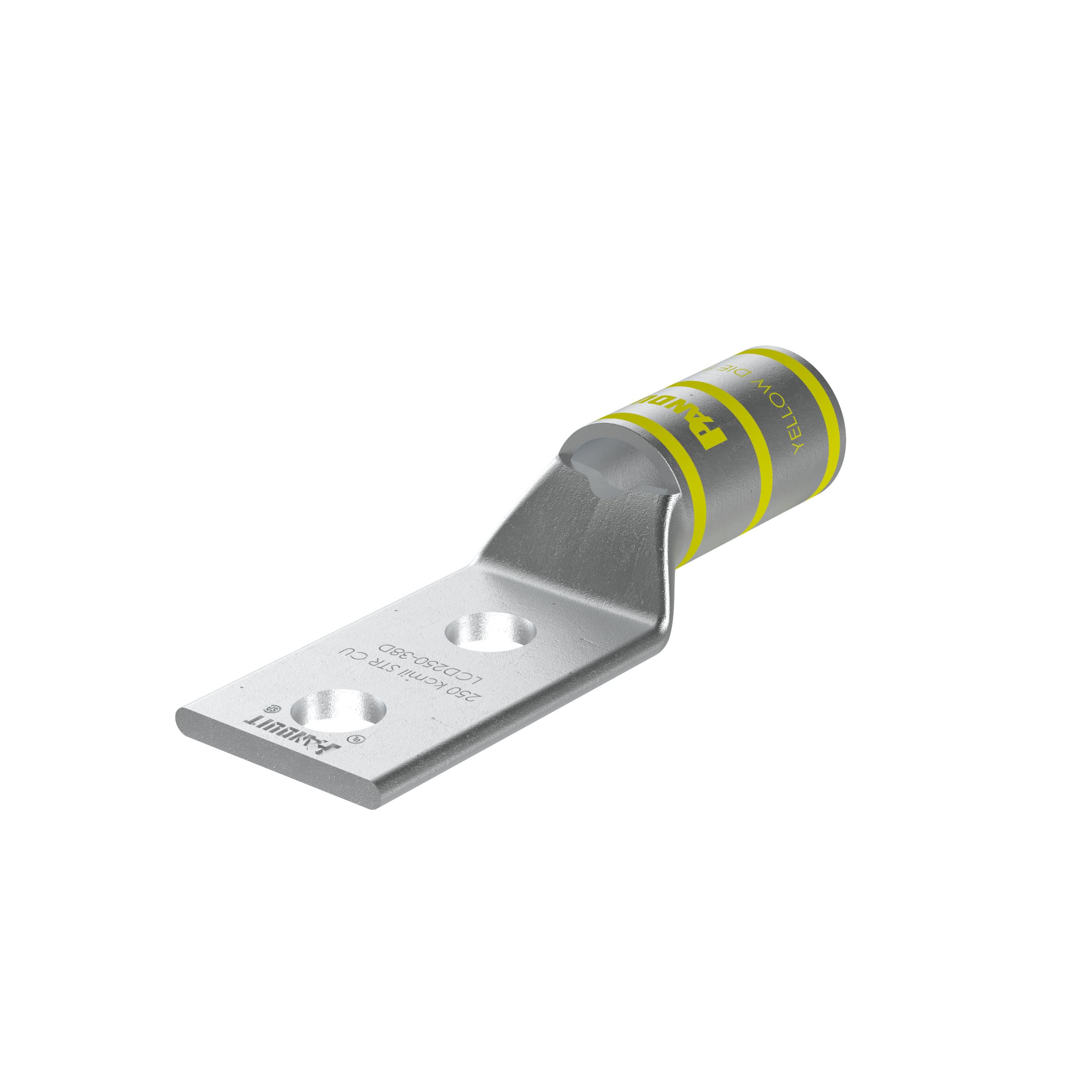 La cosse de compression étamée en cuivre à deux trous et fût standard LCD250-38D-X possède des fûts à codage couleur et marquage avec numéros d'index de matrice Panduit et concurrents pour une sélection de matrice de sertissage adéquate. Une fenêtre d'inspection permet d'assurer visuellement l'insertion complète des conducteurs, et la finition étamée permet d'inhiber la corrosion. Homologué UL et certifié CSA pour 35 kV et température homologuée à 90 °C.