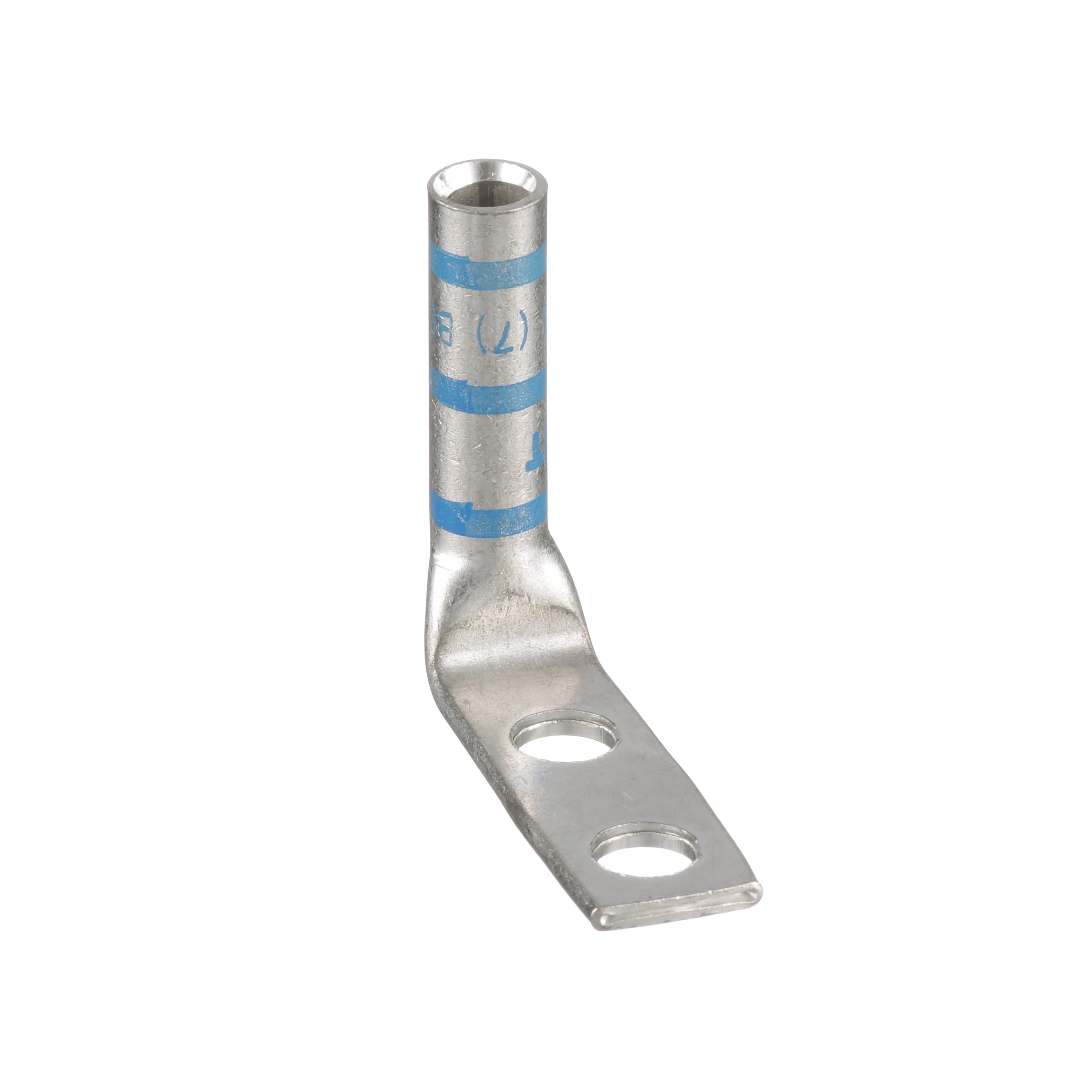 Cosse souple à deux trous à long fût, fil #6 AWG, trou de goujon 1/4, espacement de trou 0,63, patte à 90°.