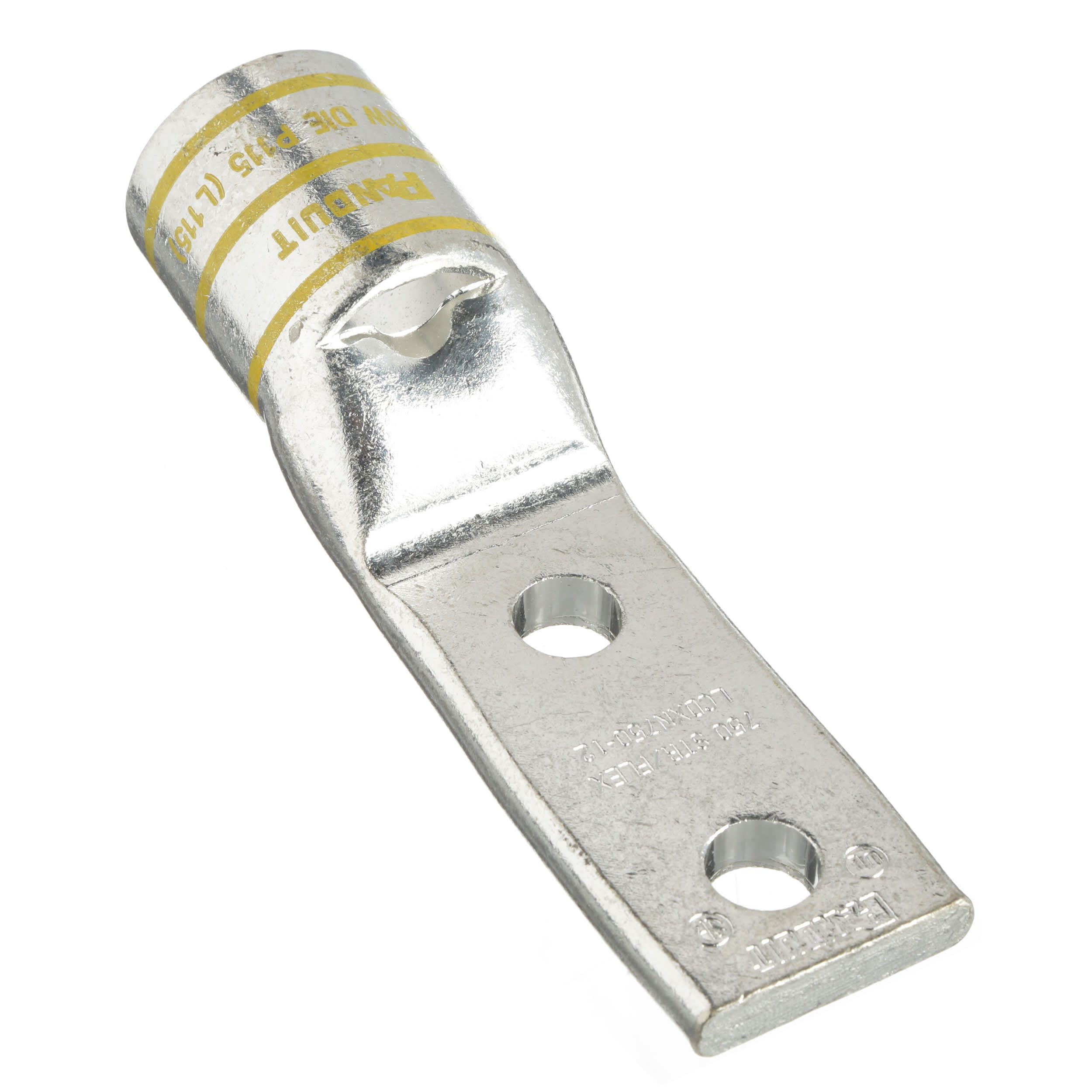 La cosse souple de compression en cuivre à deux trous à fût standard avec fenêtre d'inspection et patte étroite possède un conducteur souple locomotive diesel d'une taille de 777,7 kcmil. Le trou de goujon mesure 1/2 (12,7 mm) et l'espacement de trou est de 1,75 (44,45 mm).