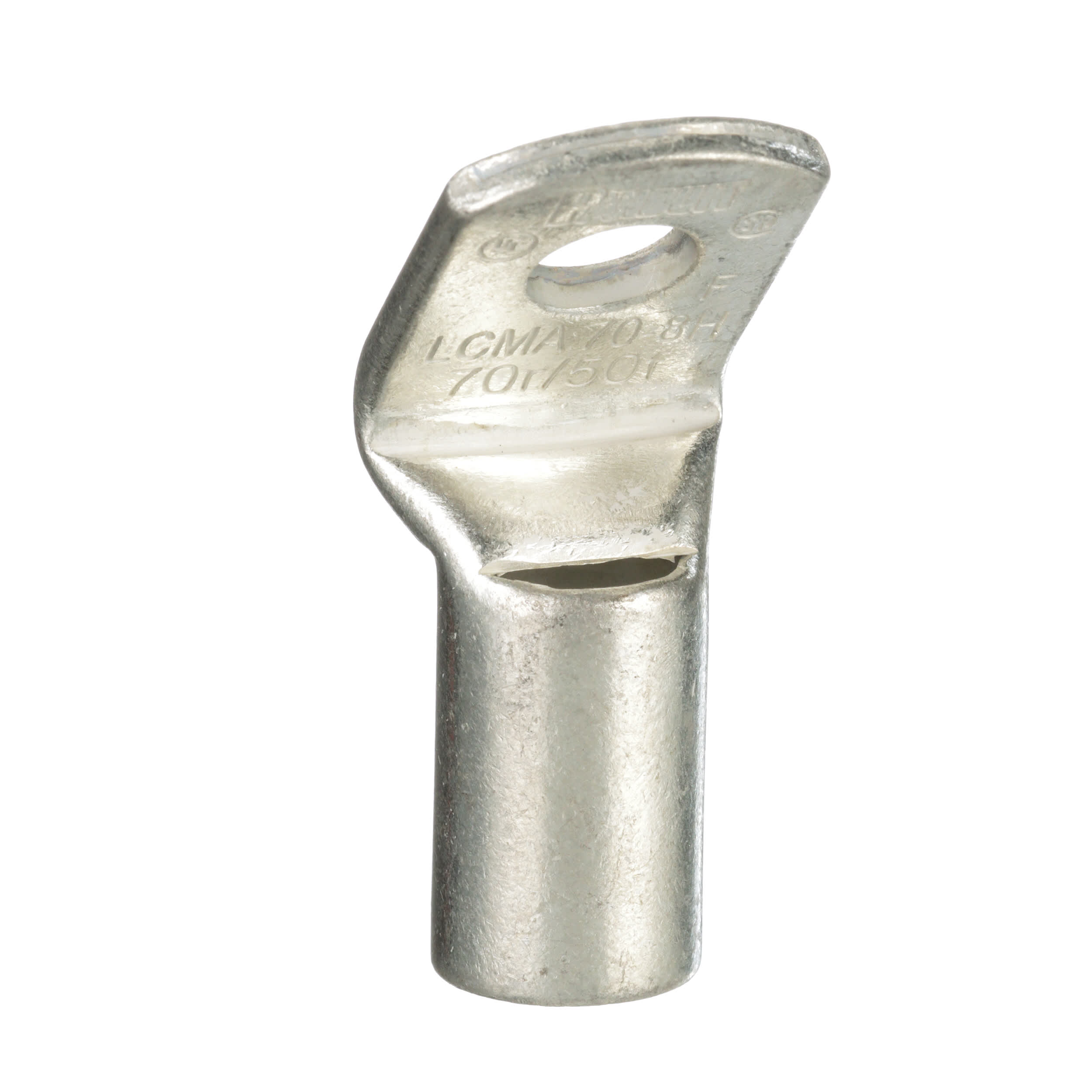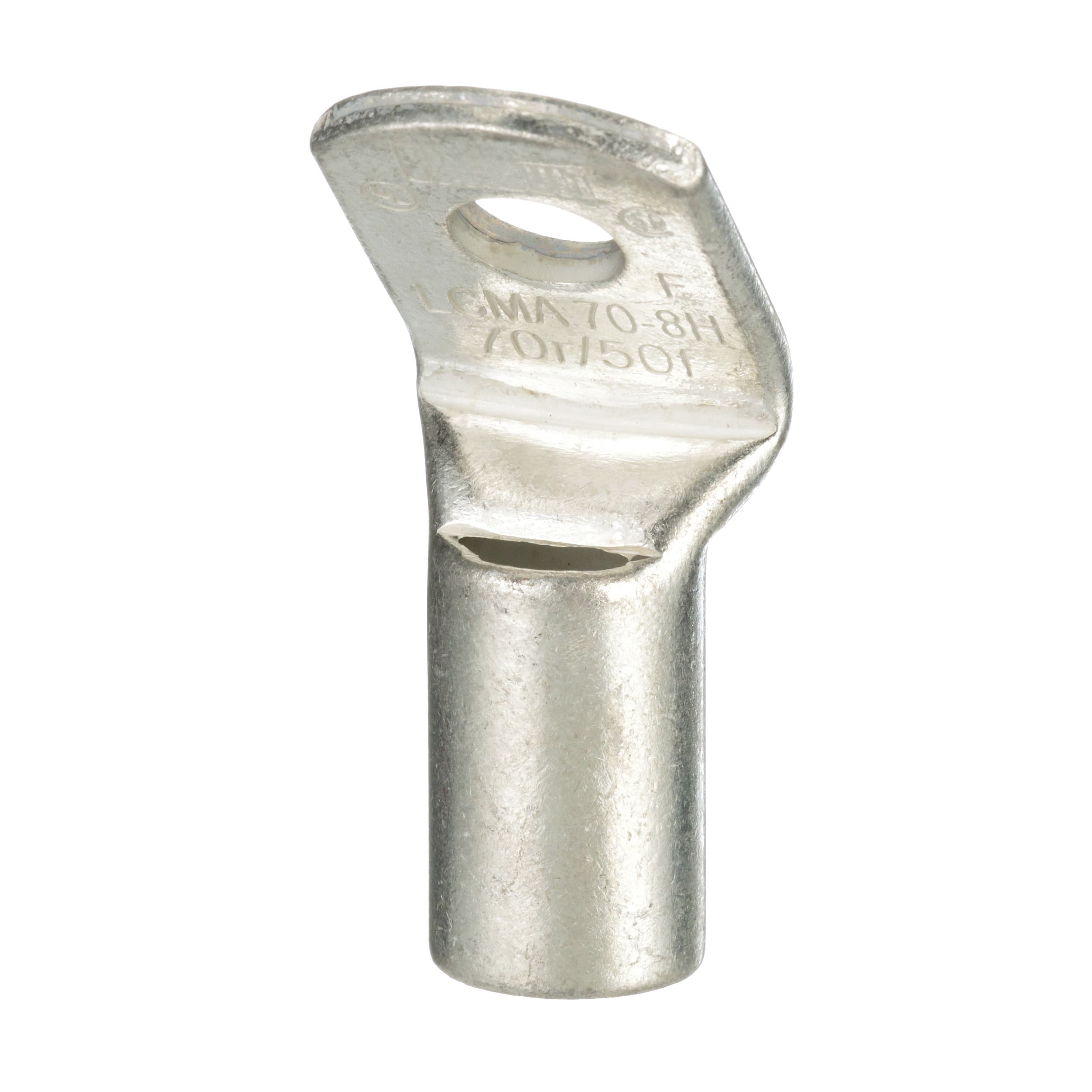 Cosse à un trou à fût standard à fenêtre, conducteur métrique, fil 70 mm² 2r, 50 mm² classe 5f/6f, trou de goujon M8, patte à 45°.