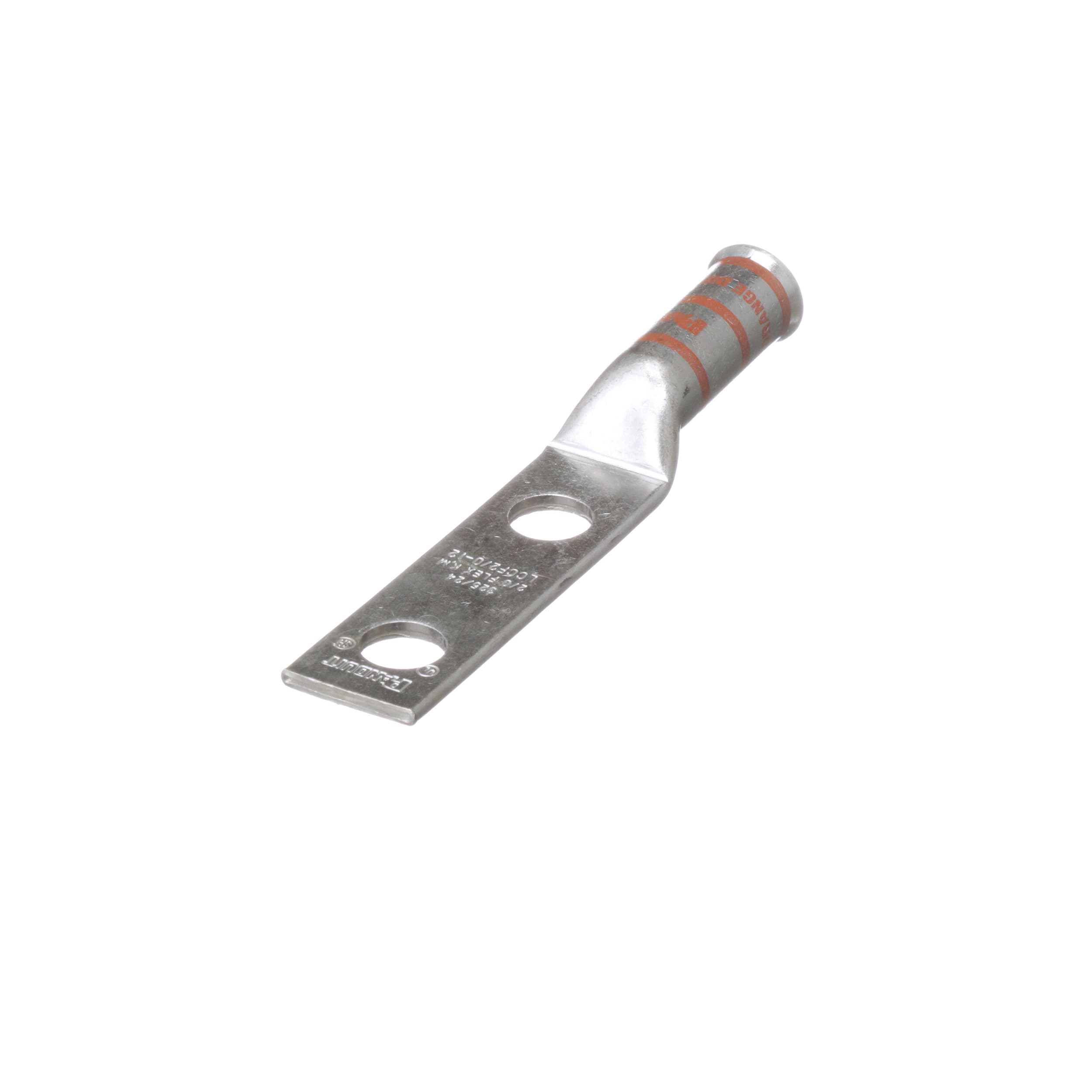 Cosse à deux trous à long fût évasé, fil 2/0 AWG, trou de goujon 1/2, espacement de trou 1 3/4, dimensions et espacement de trou NEMA.