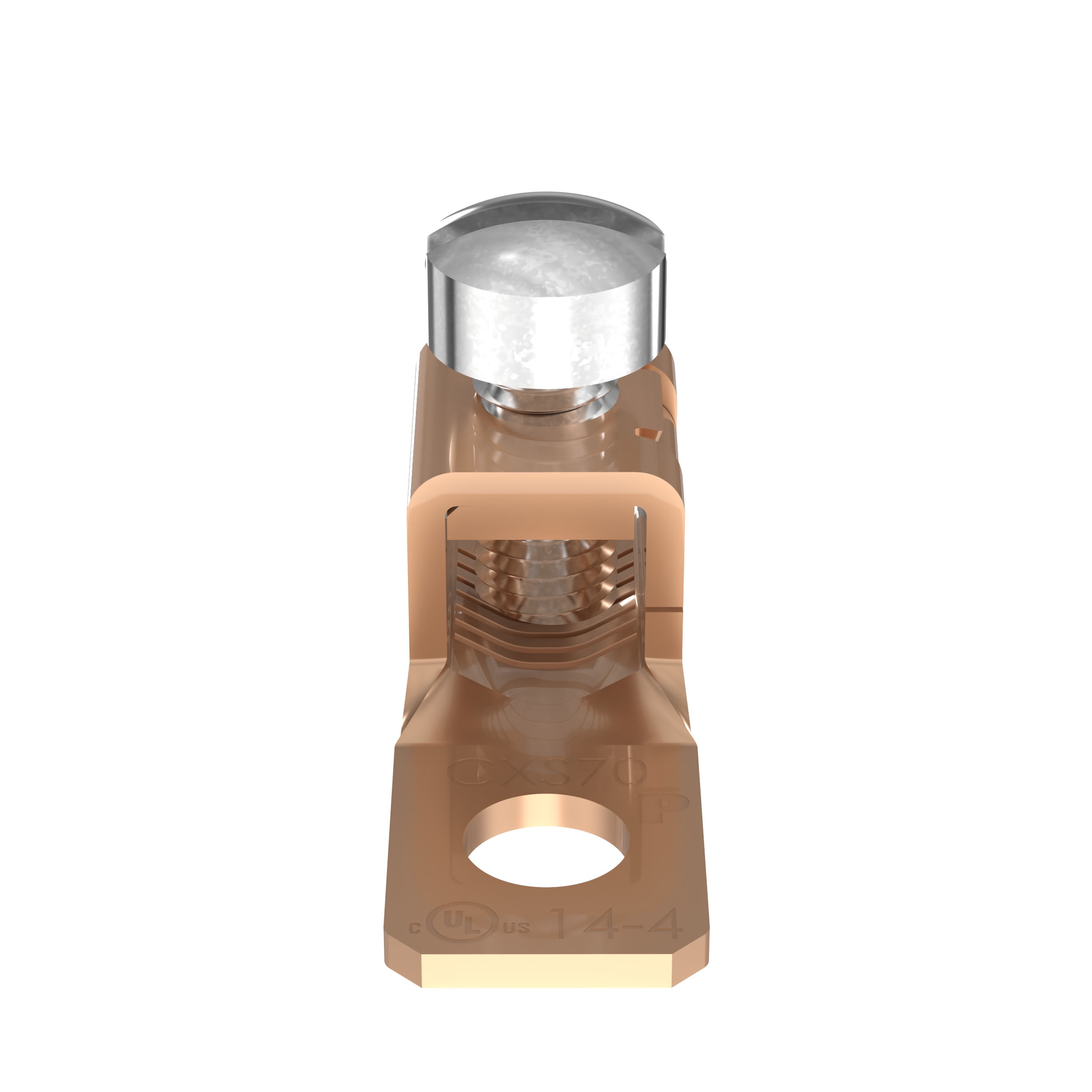 La cosse pour connecteur mécanique en cuivre CXS70-14-C à un trou et un fût, est fabriquée à partir de cuivre électrolytique à haute résistance pour fournir des performances électriques et mécaniques de première qualité pour une capacité de prise de fil à large gamme qui aide à réduire au minimum les besoins d'inventaire. La vis fendue en acier plaqué assure un contact électrique durable entre le conducteur et le connecteur. La barre de pression interne et le collier à base en V fournissent une force d'attache uniforme pour assurer un contact positif.