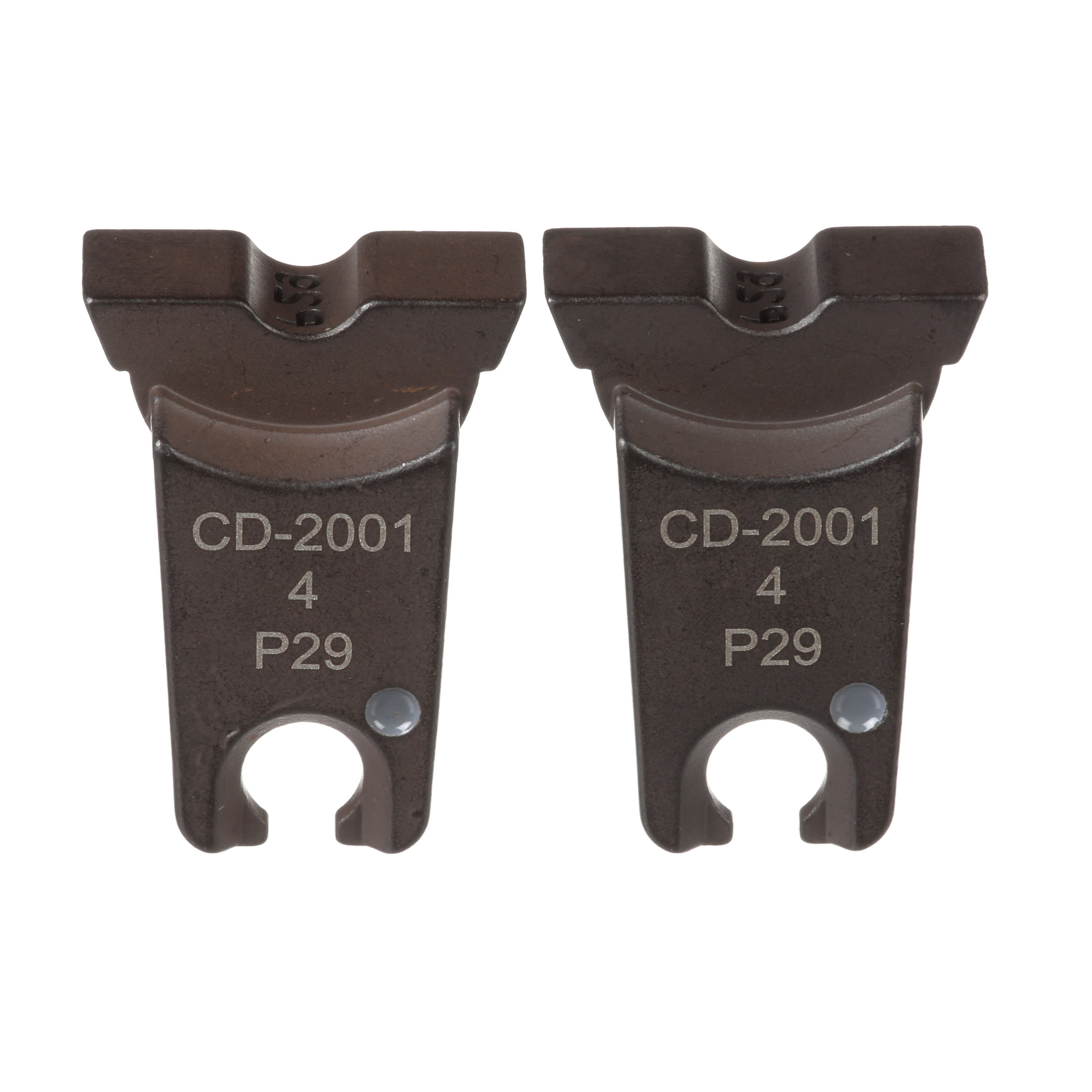 Les matrices de sertissage CD-2001-4-SET fournissent des résultats de sertissage circonférentiel dans les raccordements avec des performances électriques et mécaniques de première qualité. Elles disposent d'un code couleur pour faciliter l'appariement des connecteurs, tandis qu'un numéro d'index de matrice en relief sur les fûts des connecteurs permet d'inspecter le sertissage. Le numéro de pièce est marqué de façon permanente sur la matrice de sertissage pour une identification facile et est utilisé avec les outils des séries CT-3001/ST et CT-3001/CCP.
