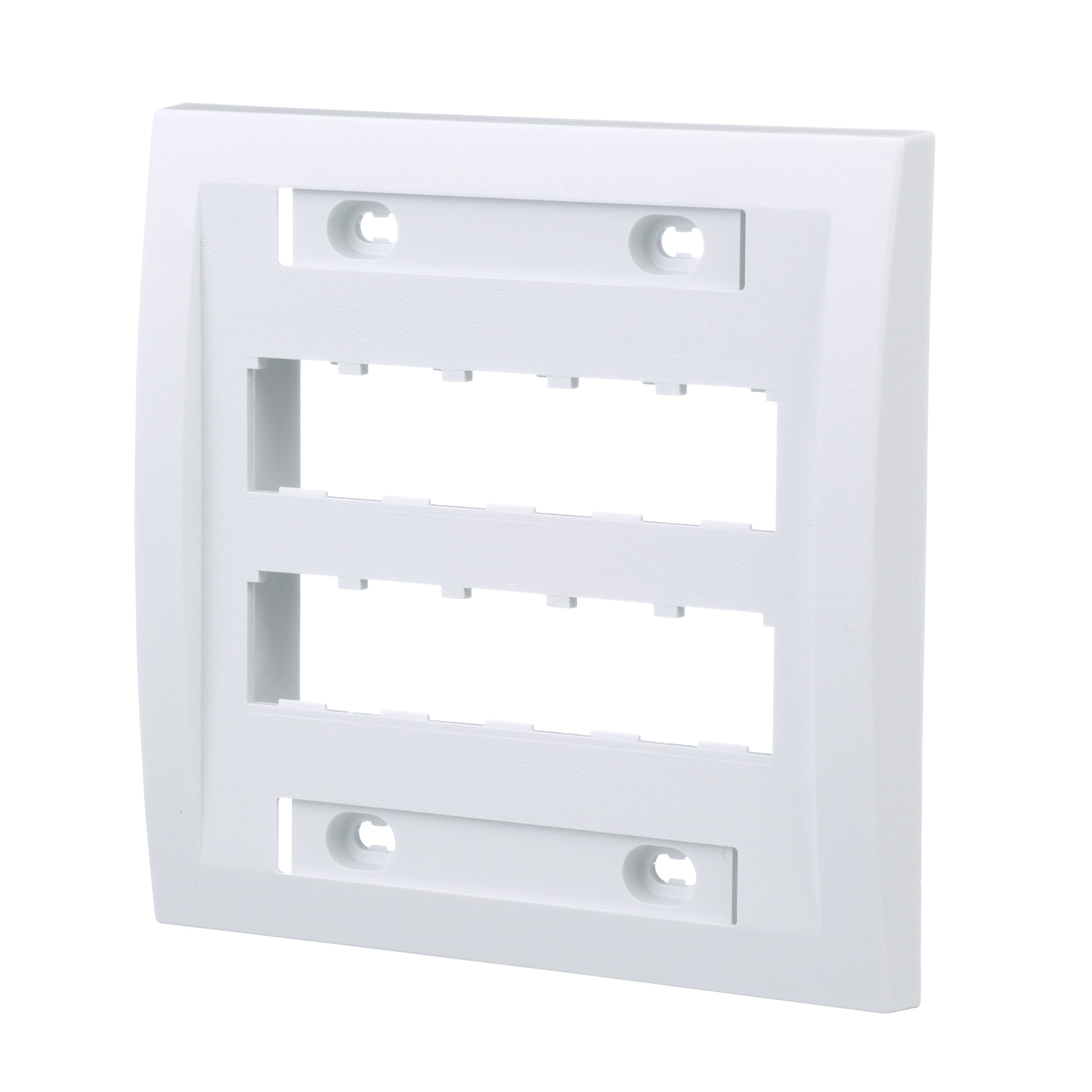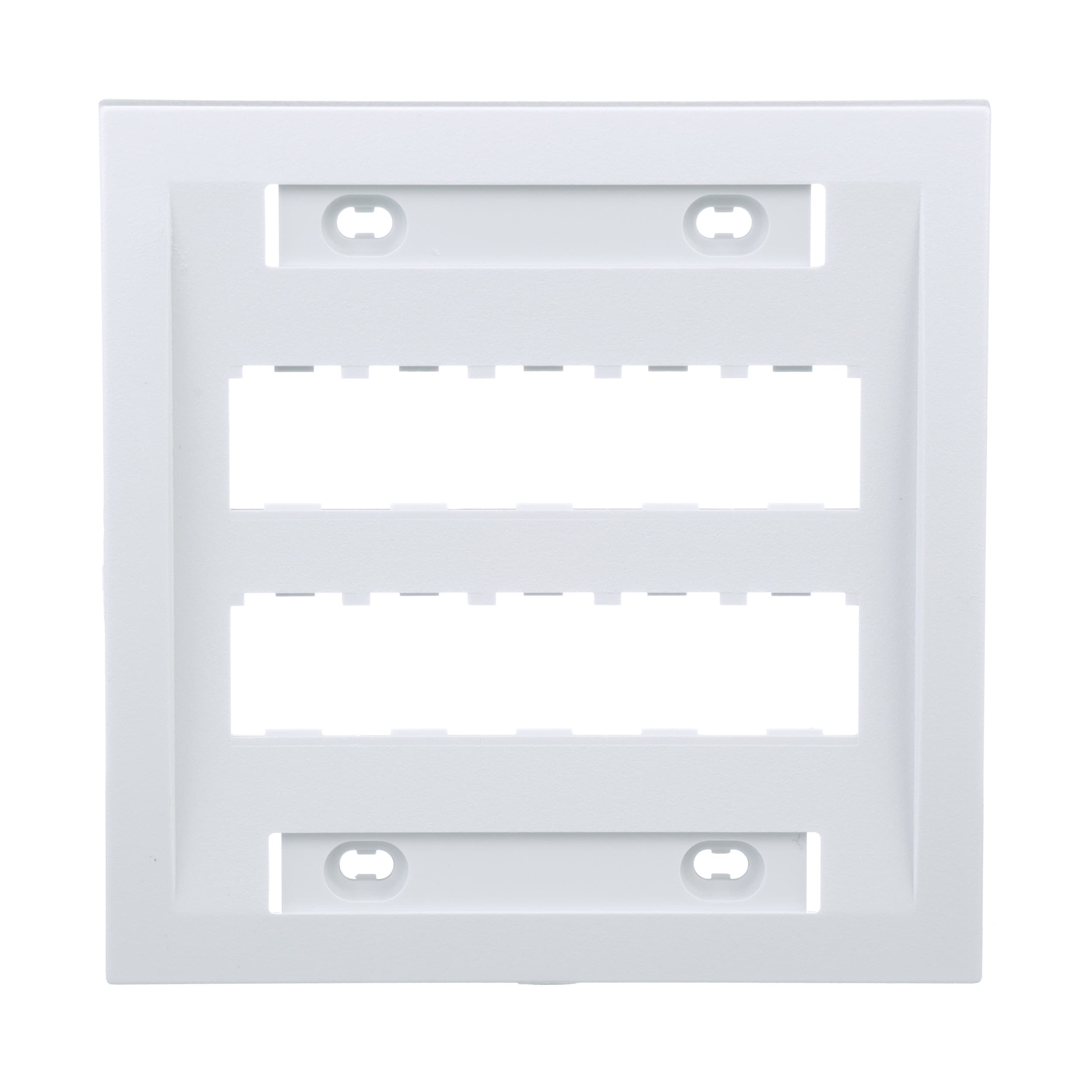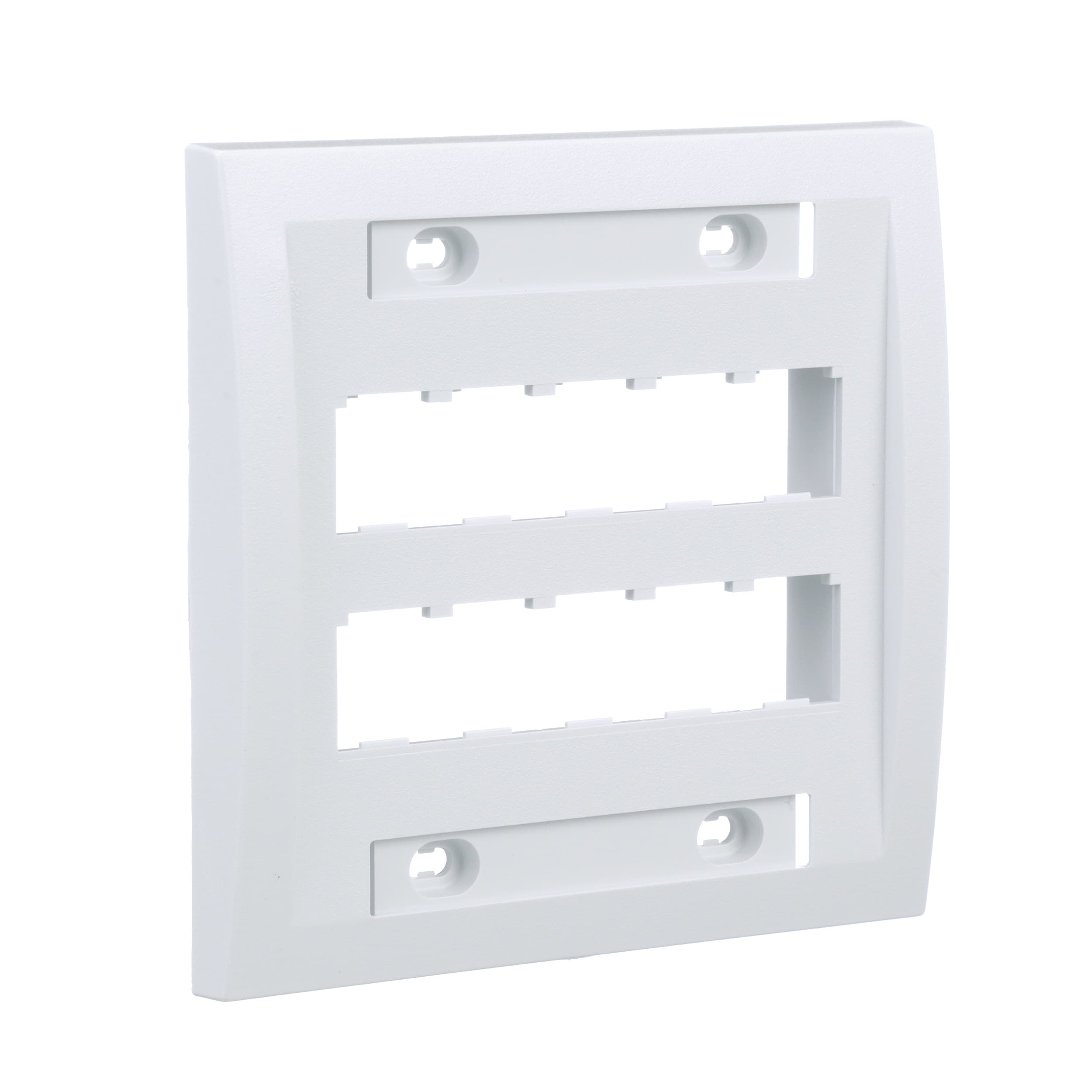 La plaque frontale Mini Com à branchement double de la série Exécutive peut accueillir dix modules Mini-Com™, fournie avec une étiquette ainsi qu’un porte-étiquette. Blanc.