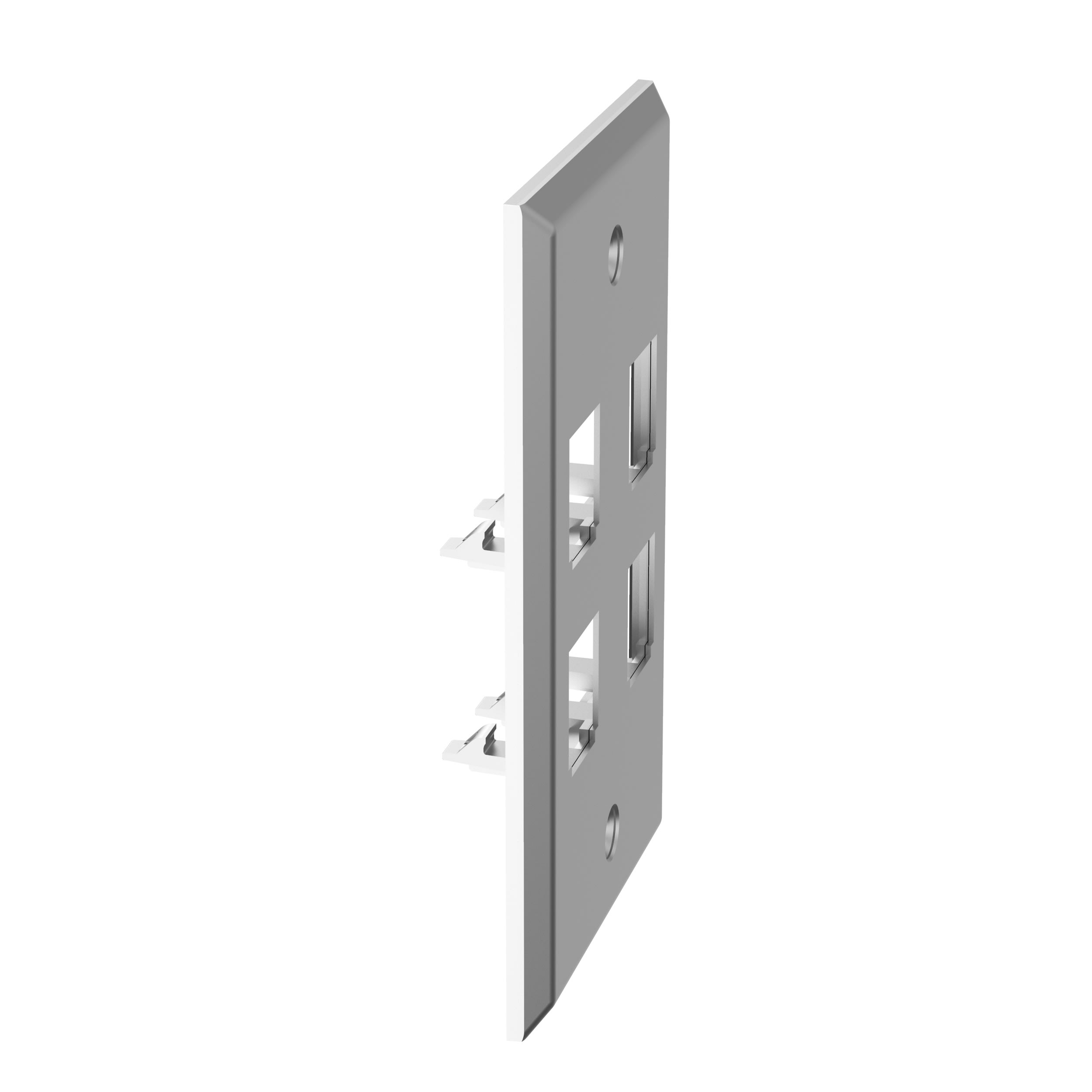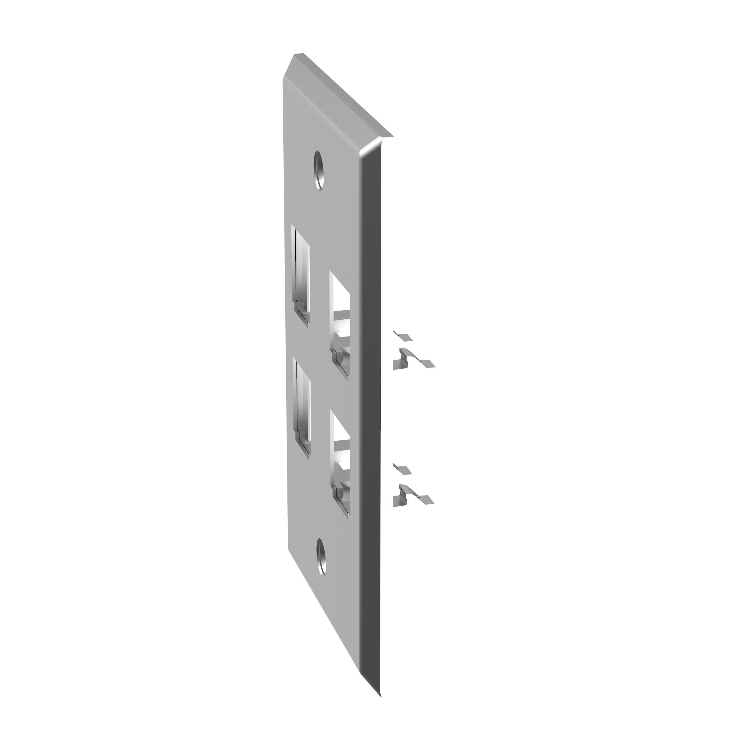 La plaque frontale en acier inoxydable Mini-Com™ peut accueillir quatre modules Mini-Com. La plaque frontale est à branchement simple et se monte sur une ouverture à branchement simple standard NEMA. La plaque frontale peut être identifiée avec une étiquette adhésive et est en matériau résistant aux impacts pour soutenir les installations dans des zones à fort trafic.