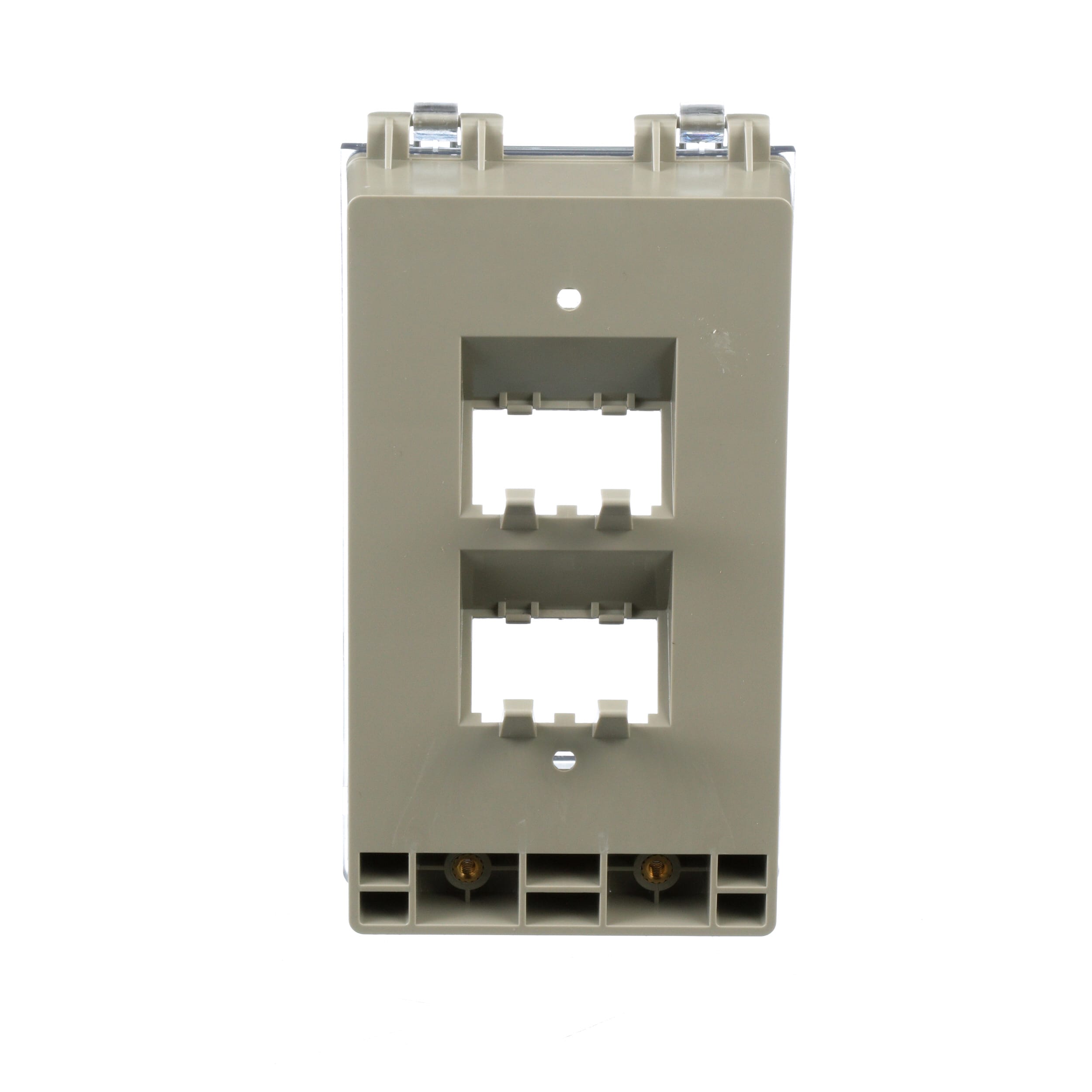 La plaque frontale inclinée étanche Mini-Com™ peut accueillir quatre modules Mini-Com™. La plaque frontale est conforme à la norme IP 56, à simple entrée et inclinée, et comprend un couvercle articulé, des joints et des vis. Couvercle transparent et socle gris.