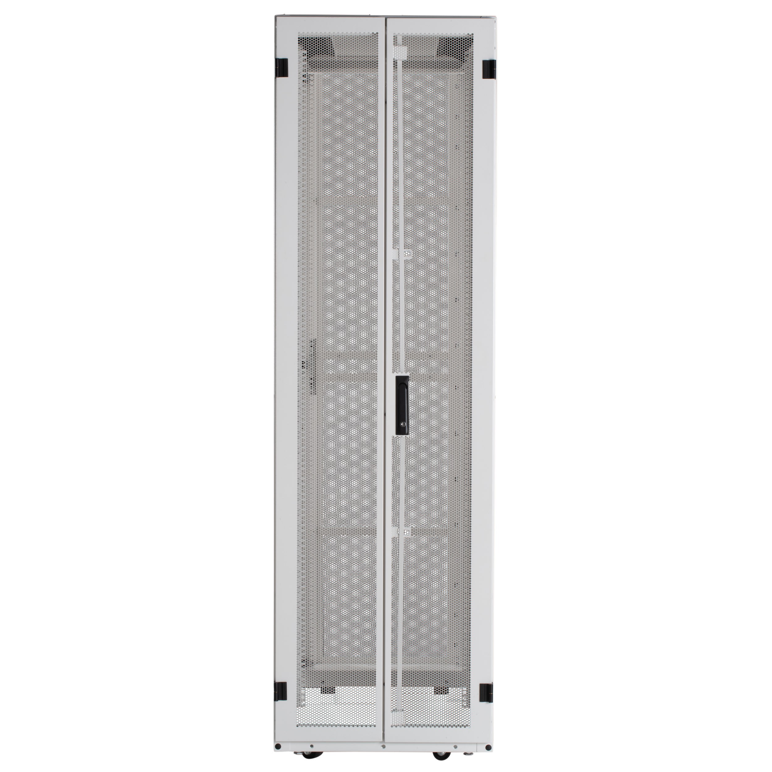 800 mm × 42 U × 1200mm, blanc, avec porte avant perforée à charnière, porte arrière perforée en 2 parties, panneaux latéraux gauche et droit, rails d'équipement à écrou-cage, jeu de support de montage de PDU, roulettes
