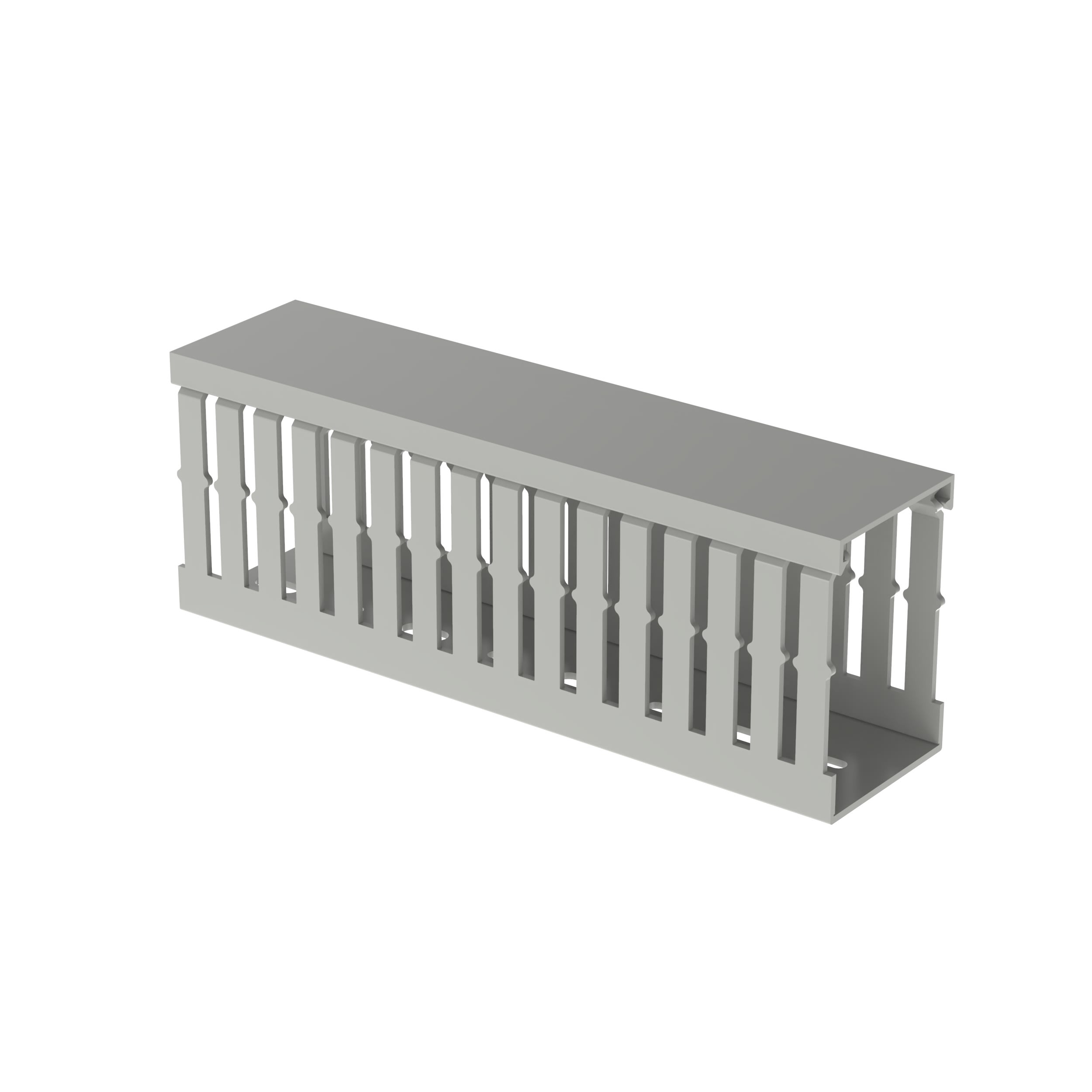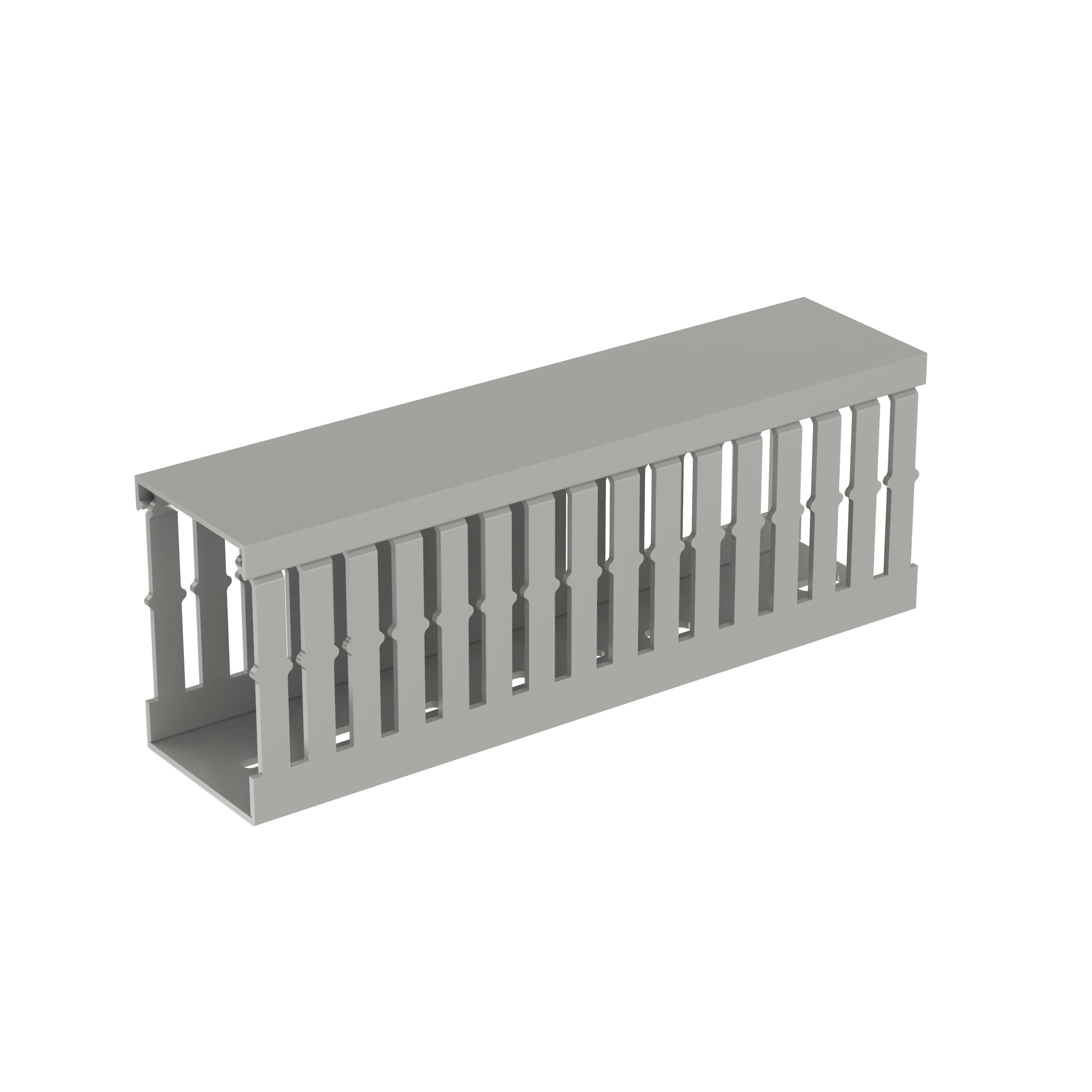 Goulotte de câble en PVC sans plomb à fente étroite MC50X75IG2, 49,5 mm × 72,4 mm. Conception à fente/bande étroites correspondant à l'espacement des composants haute densité. Les lignes de repère permettent un retrait facile de la section bande/paroi latérale. Classe d'inflammabilité UL 94 V-0 pour l'utilisation en continu à des températures allant jusqu'à 50 °C. Trous de montage fournis. PVC sans plomb. Capot inclus. Coloris : gris international. 10 m par pack (5 pièces, bases et capots).