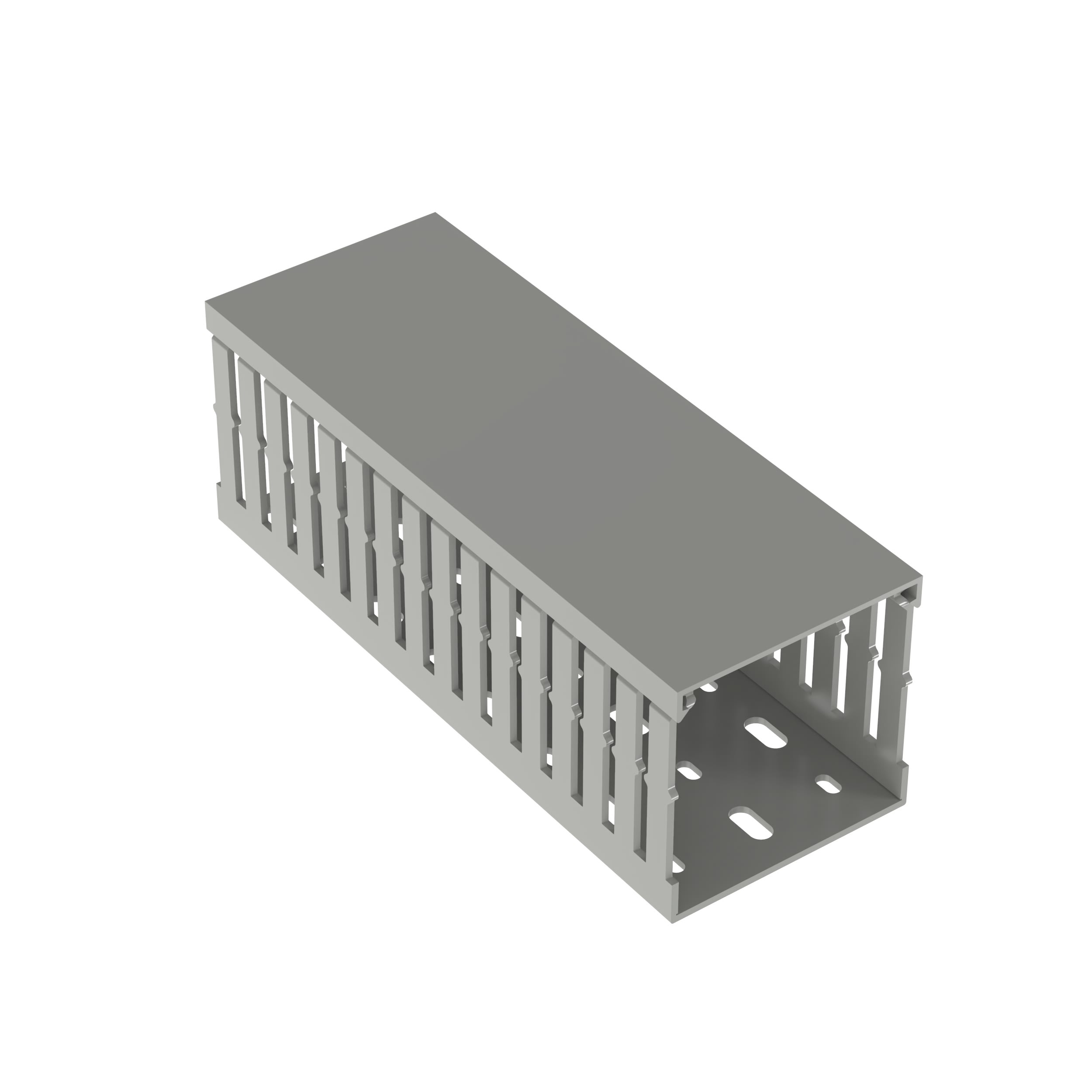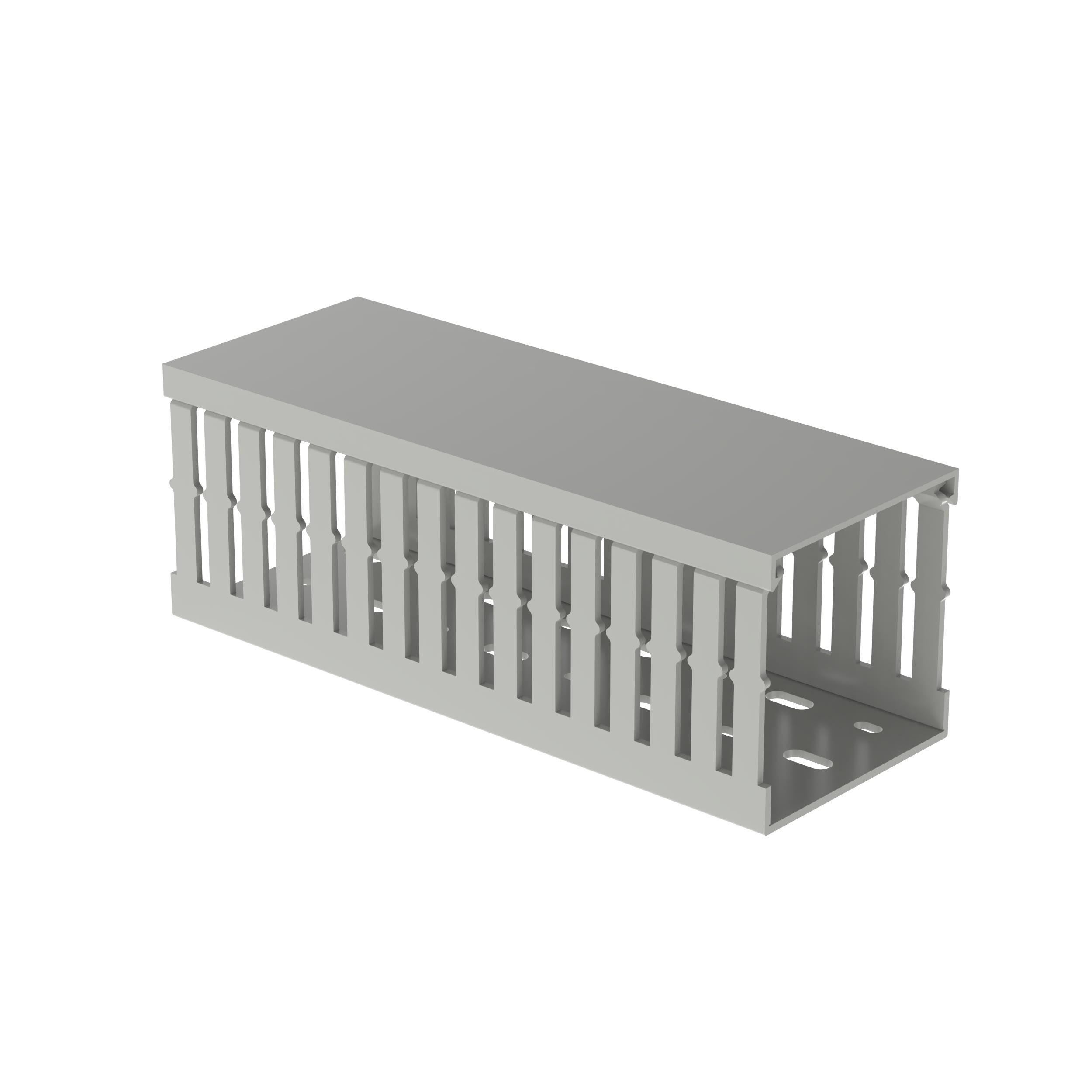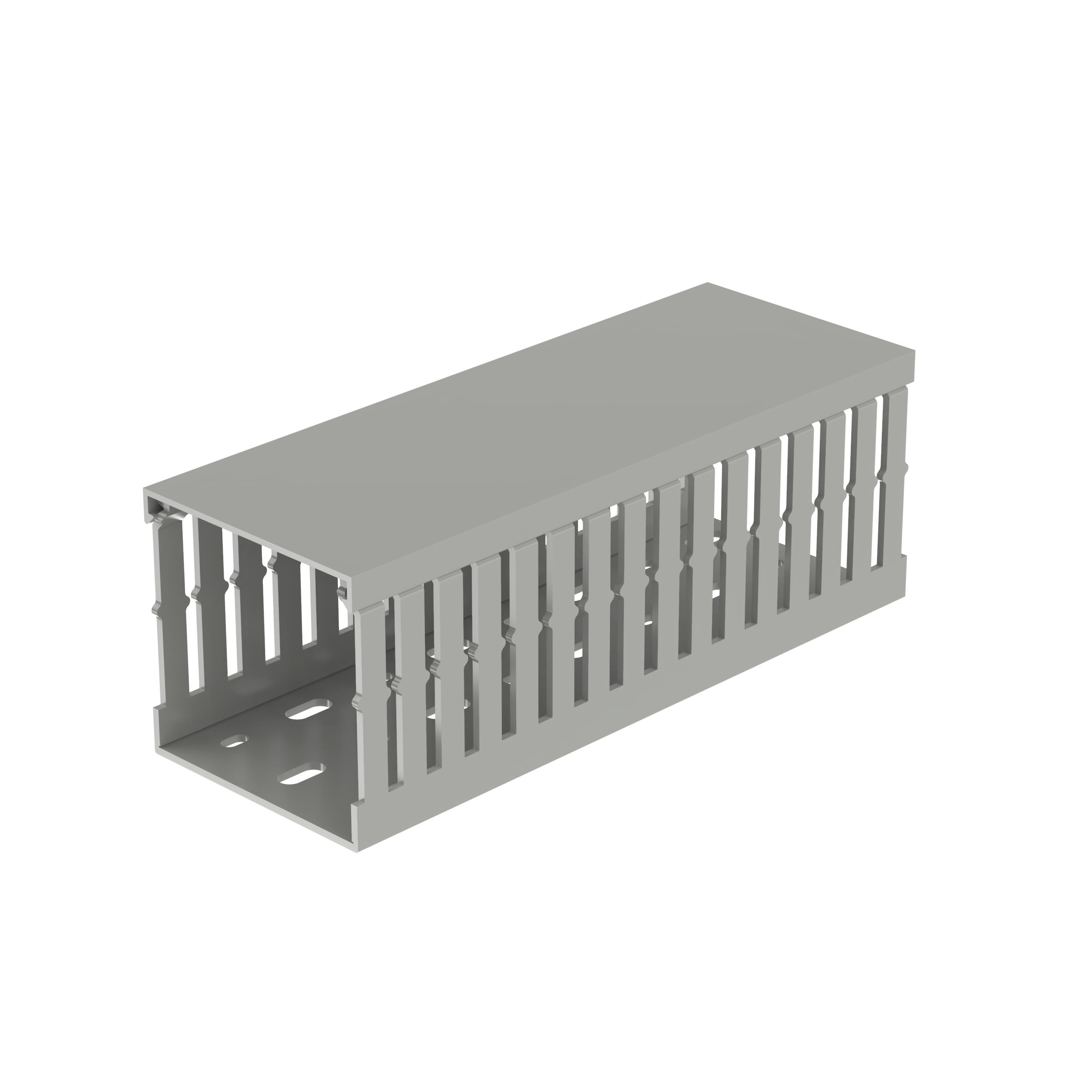 Goulotte de câble en PVC sans plomb à fente étroite MC75X75IG2, 74,7 mm × 72,4 mm. Conception à fente/bande étroites correspondant à l'espacement des composants haute densité. Les lignes de repère permettent un retrait facile de la section bande/paroi latérale. Classe d'inflammabilité UL 94 V-0 pour l'utilisation en continu à des températures allant jusqu'à 50 °C. Trous de montage fournis. PVC sans plomb. Capot inclus. Coloris : gris international. 10 m par pack (5 pièces, bases et capots).