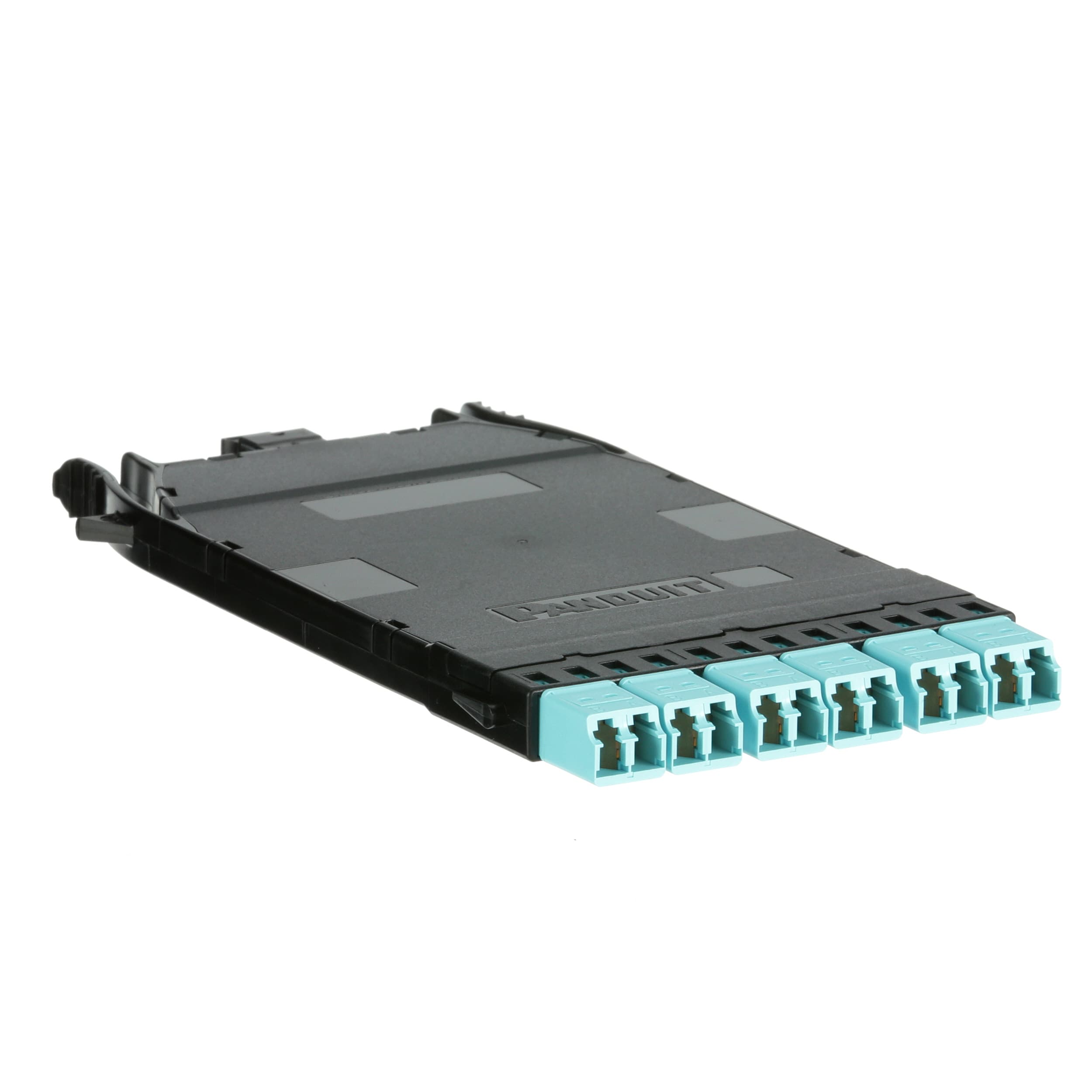 La cassette HD Flex™ est une cassette OM3, MPO-LC et prend en charge 12 fibres au total. Elle dispose d'une perte d'insertion standard et utilise la polarité de méthode modifiée A avec des paires inversées. La cassette dispose d'un capot noir avec un connecteur MPO noir et de 6 adaptateurs duplex LC de coloris bleu aqua avec des obturations intégrales pour empêcher toute contamination.