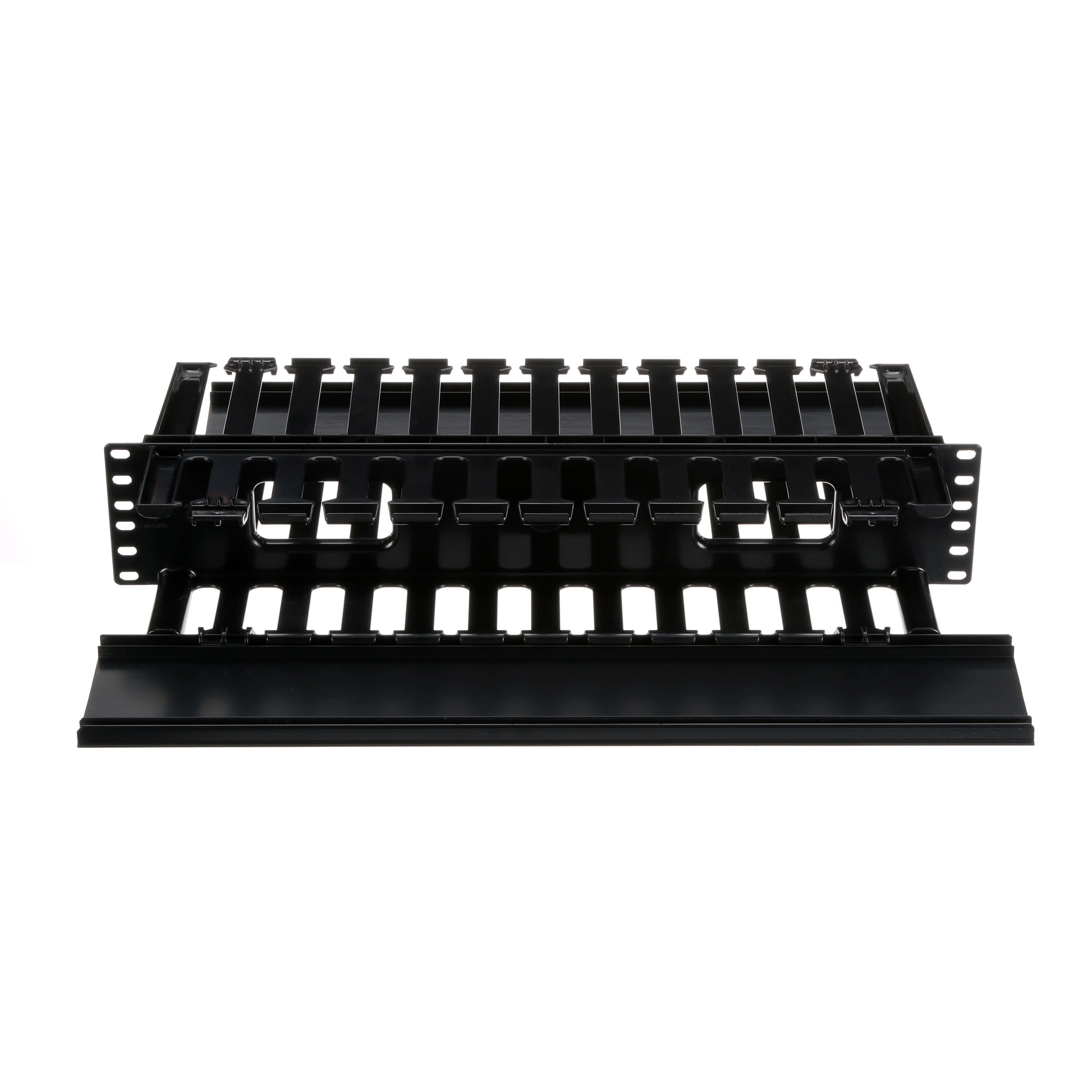 Le guide-câble horizontal PatchLink™ est un moyen soigné et efficace de gérer des câbles sur tout rack ou toute armoire standard EIA de 19 pouces (483 mm). Il permet de gérer des câbles coaxiaux, optiques ou en cuivre. Les bandes flexibles organisent les cordons de raccordement, simplifiant les déplacements, les ajouts et les changements tandis que la conception « fermée » sécurise les câbles de raccordement dans la filière. Le guide-câble à double face comporte 2 U, présente des capots avant et arrière à double charnière et des clips de rayon de courbure. Le guide-câble est noir.