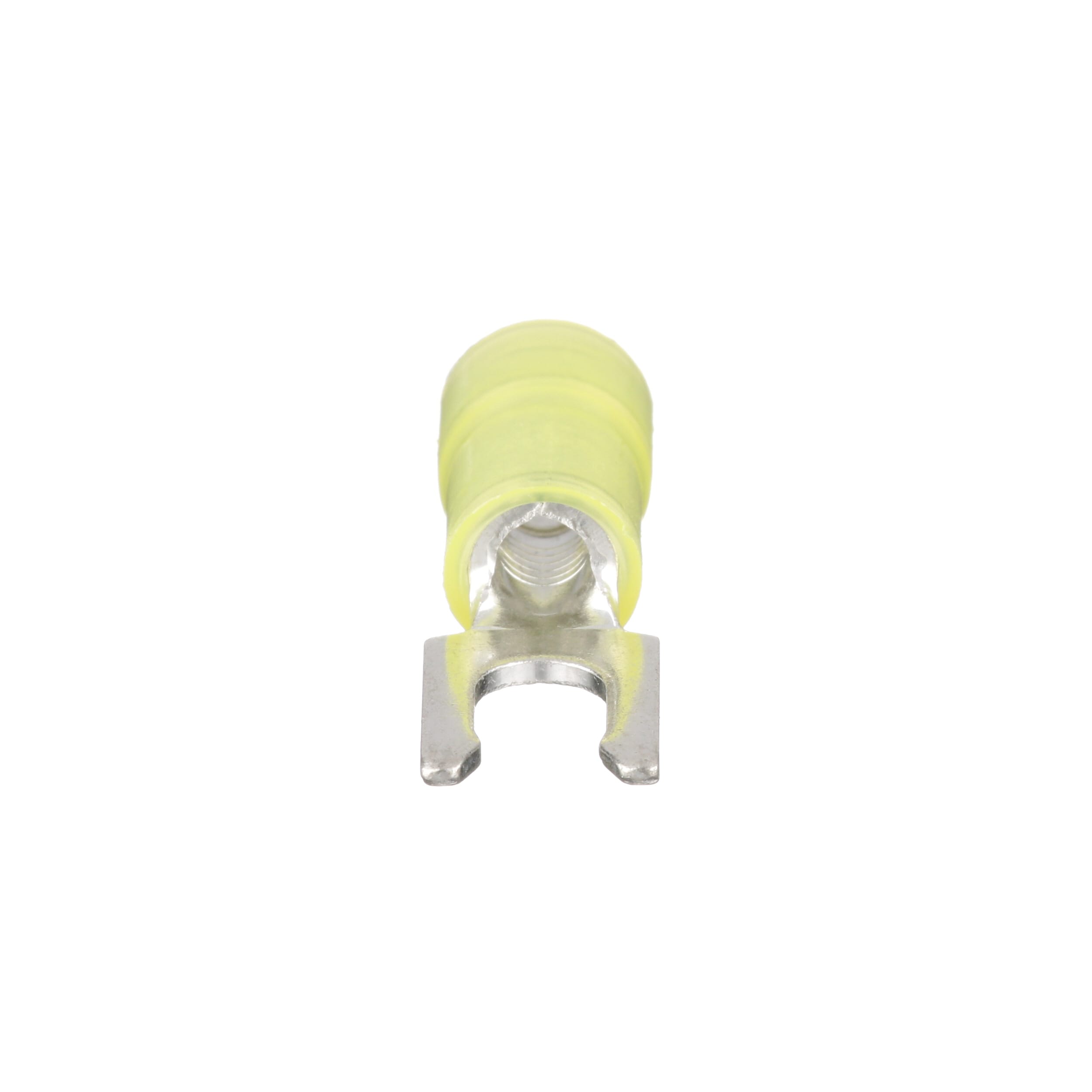 Cosse à fourche de verrouillage, isolation en polyamide, entrée en entonnoir, 12-10 AWG, taille de goujon #10, conditionnement standard.