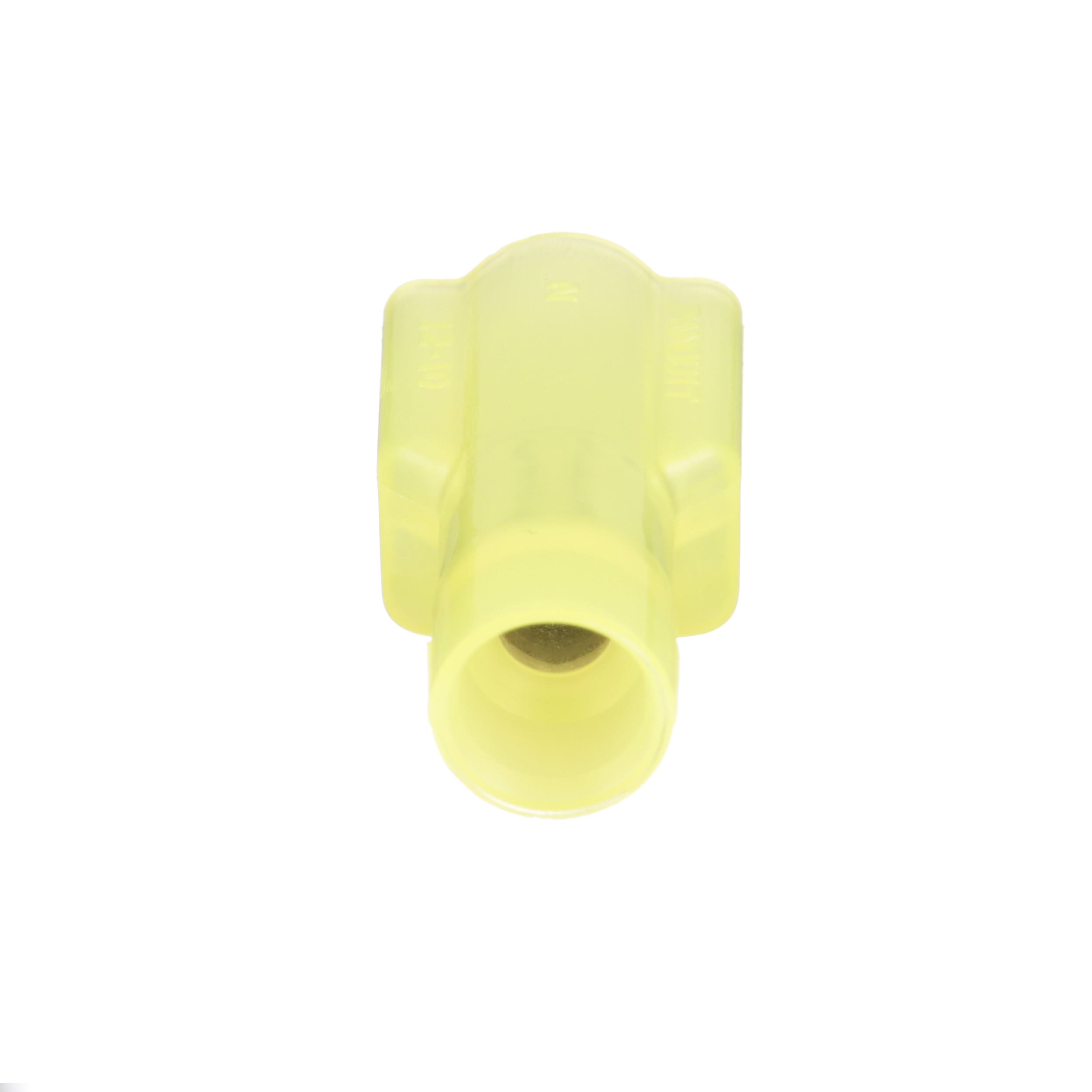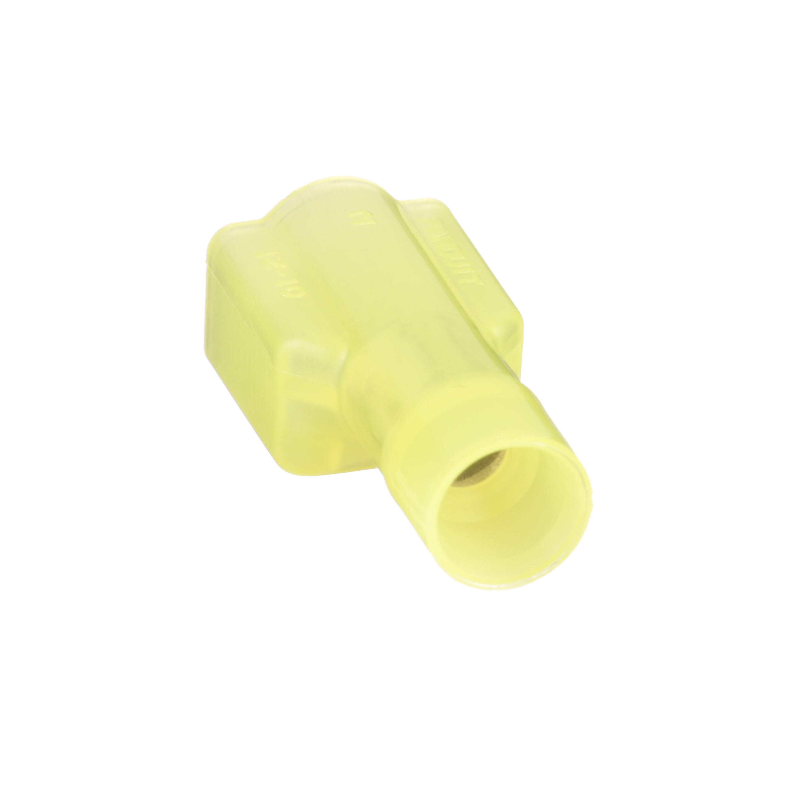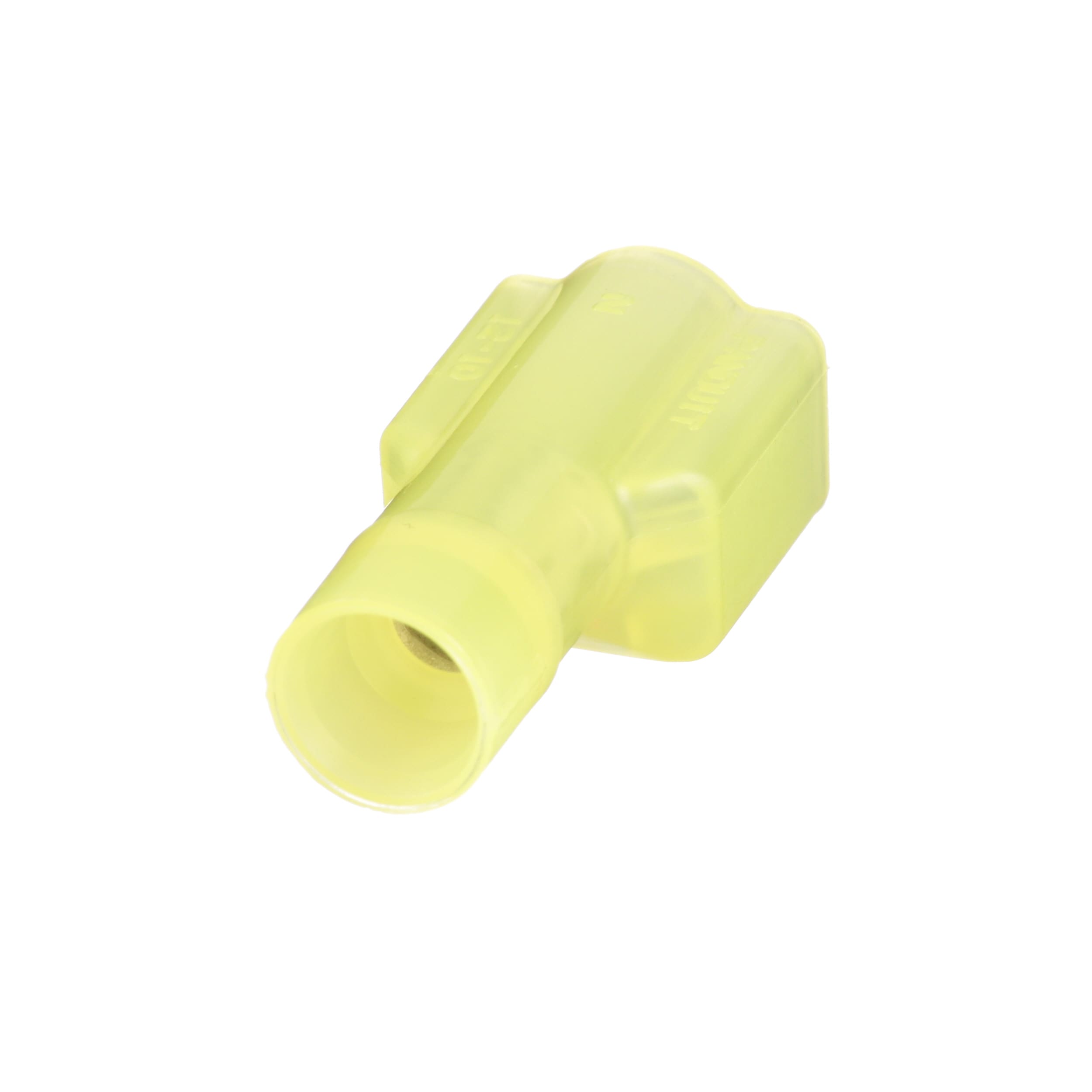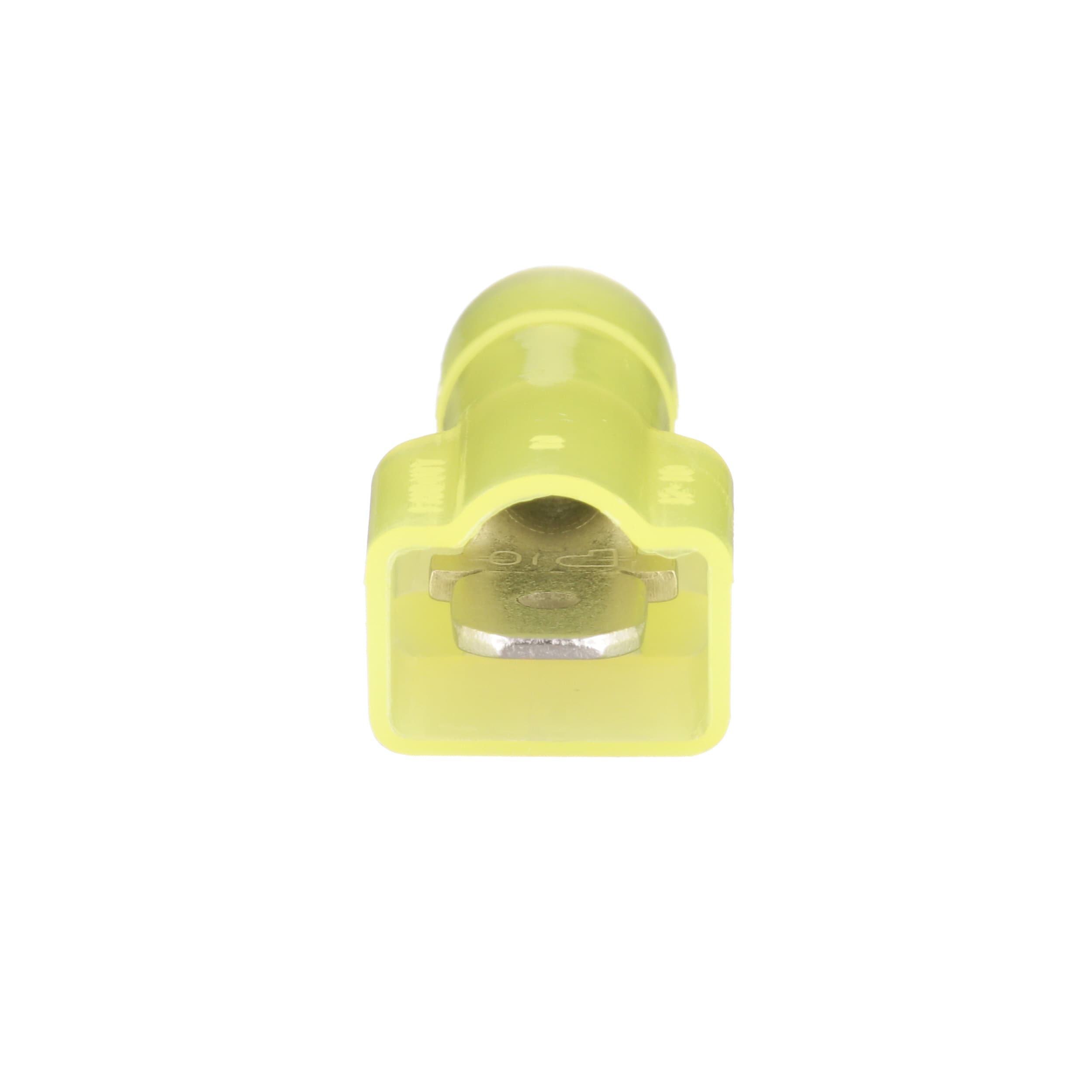 La déconnexion mâle résistante aux vibrations est fabriquée en cuivre nickelé. Elle est totalement isolée grâce à son étui de grande taille en polyamide jaune. Les dimensions de l'attache sont de 0,250 x 0,032" (6,3 x 0,8 mm). La déconnexion peut accueillir un fil de calibre 12-10 AWG (4,0-6,0 mm²). Elle mesure 0,96" (24,4 mm) de long et 0,22" (5,6 mm) de large. La déconnexion possède une douille standard ainsi qu'une douille sertie. Elle est vendue en flacons de 25.