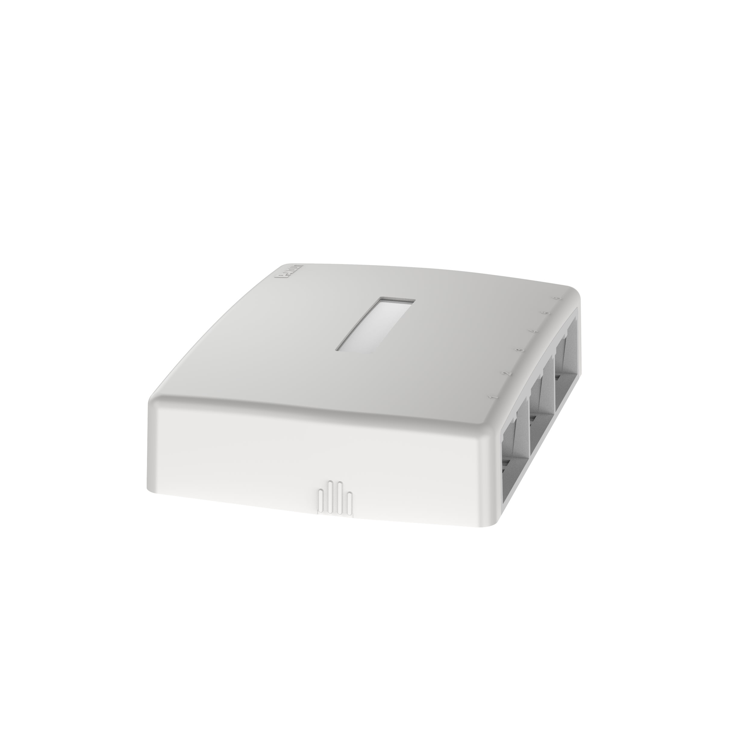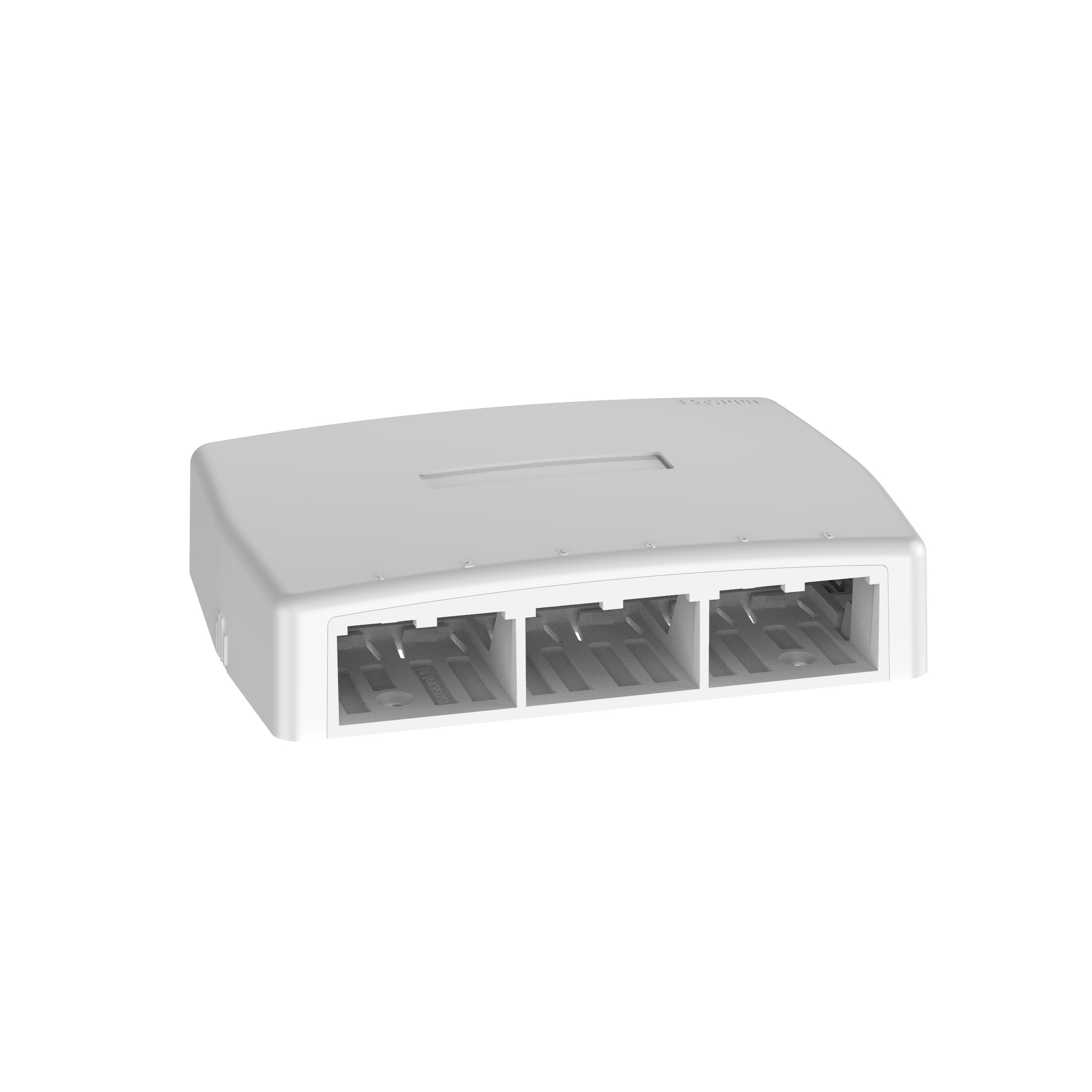 Le boîtier de fixation en saillie Mini-Com™ est homologué pour plénum et peut accueillir six modules Mini-Com. Le capot dispose d'un mécanisme de libération rapide qui permet un accès facile aux modules ; le capot peut être fixé avec une vis. Le boîtier offre de nombreuses options de montage utilisant du ruban adhésif, des vis ou un aimant en option. Le boîtier inclut une poche à étiquettes pour une identification facile et est de coloris blanc cassé.