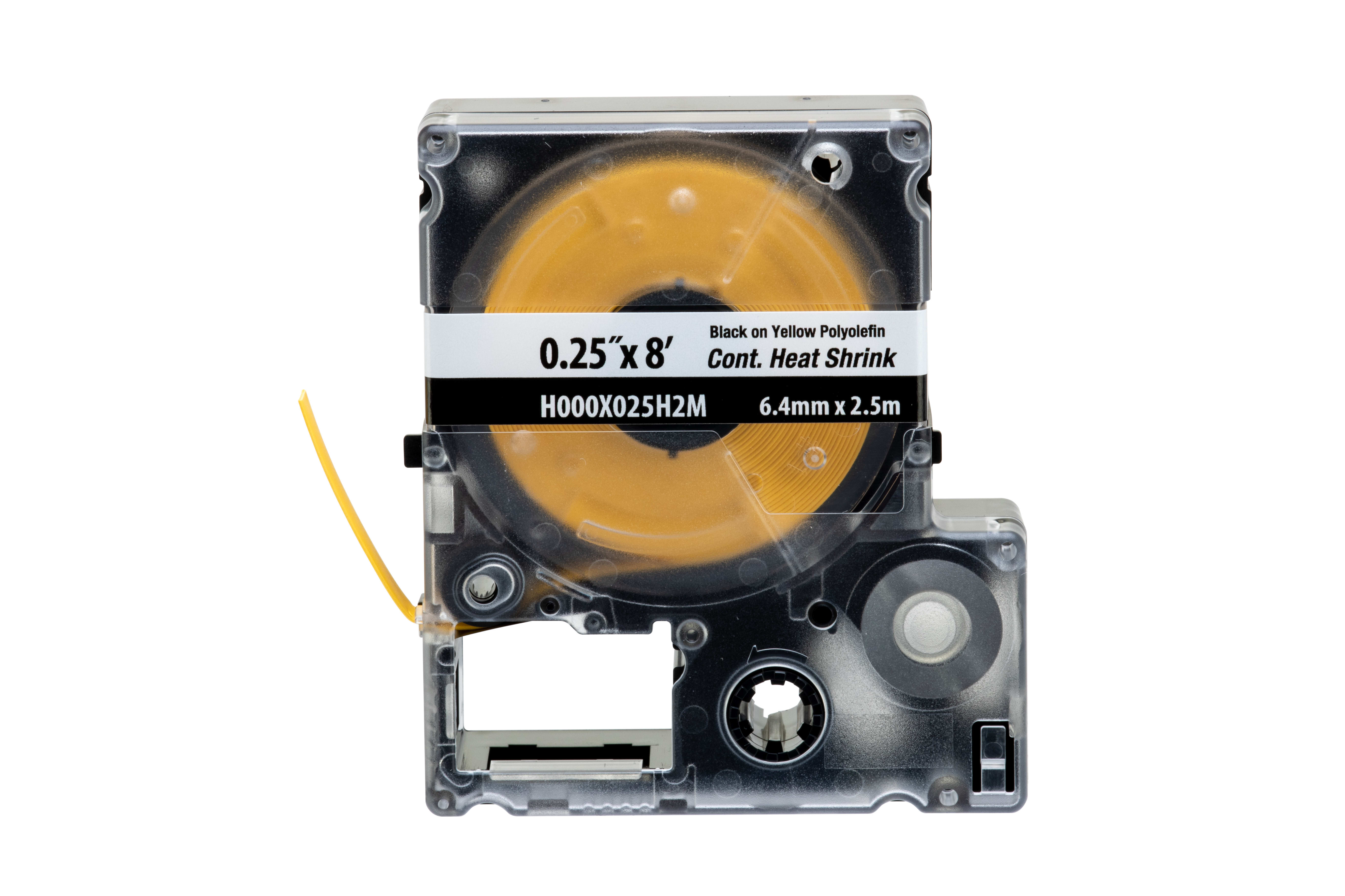 Les étiquettes jaunes à gaine thermorétractable continues pour imprimante portable sont fabriquées en polyoléfine de qualité militaire. Elles mesurent 3,1 mm de diamètre, 2,4 m de long et 6,4 mm de large pour un calibre de fil de 22-18 AWG. La cassette d'étiquettes MP™ à chargement rapide contient à la fois le matériau pour l'étiquette ainsi que le ruban pour permettre un changement d'étiquette facile.